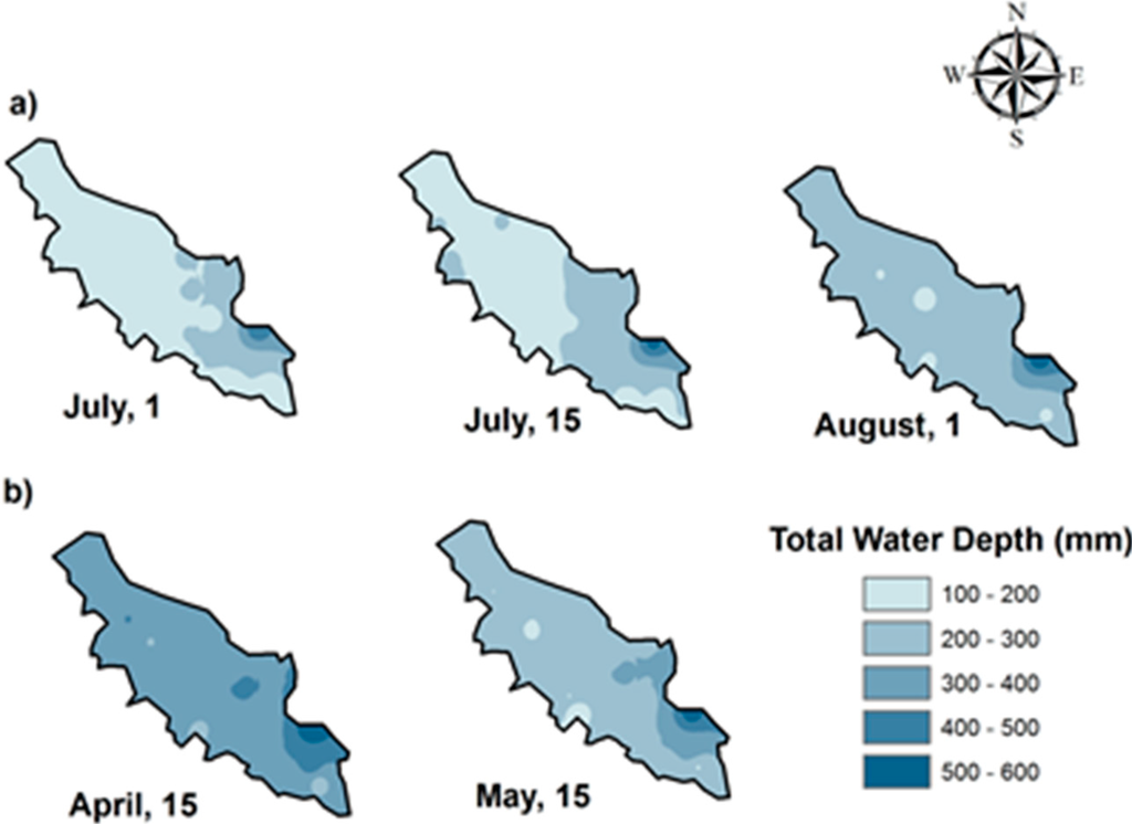 In order to prepare WF maps of ETc, precipitation and total water depth, Cartesian coordinates were assigned to each weather station and climatologic information was concatenated with ArcGis 10.2 software. The ordinary Kriging interpolation technique was used with a spherical semivariogram model. These maps allow characterizing the spatial variability of reference evapotranspiration (ET0), rainfall and total water depth.