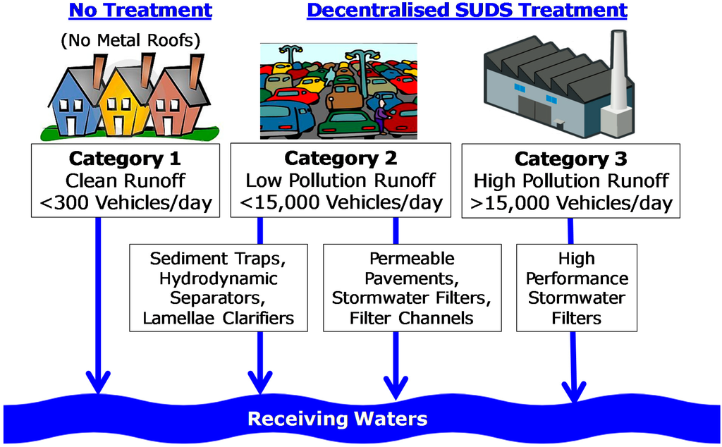 Category 1 SWR contains clean runoff from non-metal roofs and areas with no or low traffic density (less than 300 vehicles/day).Category 2 SWR must be treated before it is discharged into receiving waters or infiltrated into the ground. The following types of surface are classified as Category 2 (lightly polluted) runoff: