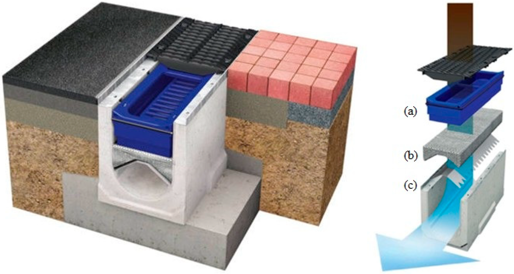 Figure 6. Typical filter channel structure: (a) sedimentation box; (b) filter bed; (c) stainless steel filter bed support [32].
