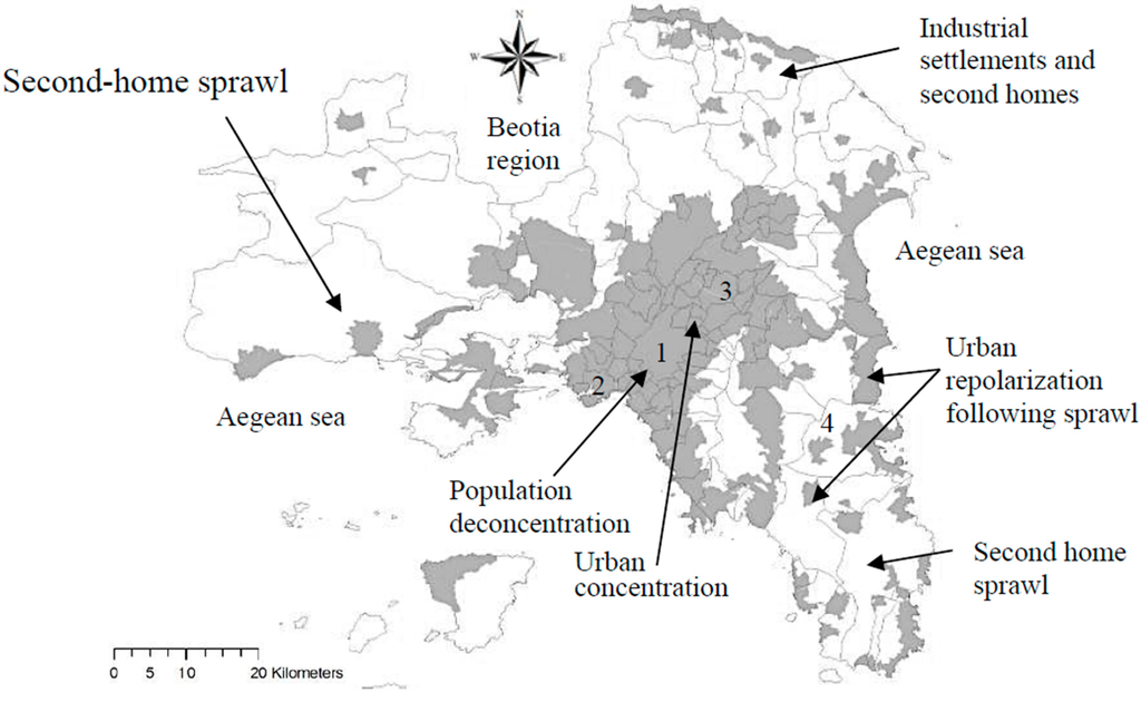 - Chorianopoulos, I.; Tsilimigkas, G.; Koukoulas, S.; Balatsos, T. The shift to competitiveness and a new phase of sprawl in the Mediterranean city: Enterprises guiding growth in Messoghia-Athens. Cities 2014, 39, 133–143. [Google Scholar] [CrossRef]