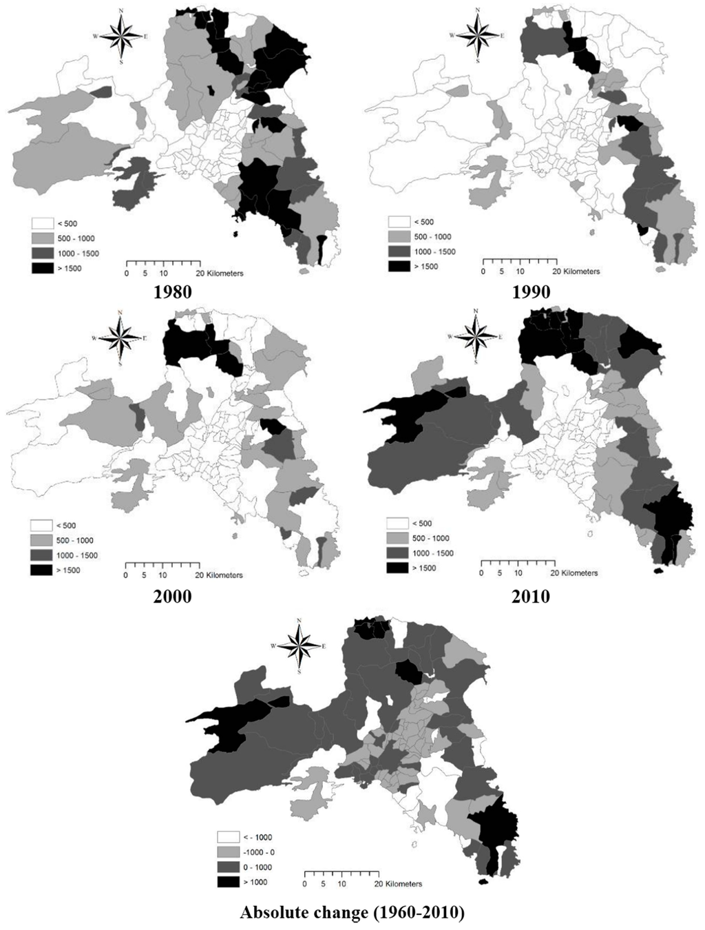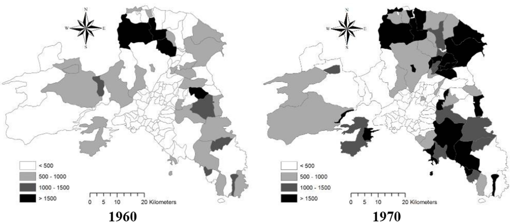 The spatial distribution of per-capita built-up area has been mapped in Figure 1 and Figure 2 by study year together with the absolute difference between 1960 and 2010. In 1960, LUE was relatively low in the whole of Attica apart from some municipalities located in the northern part of the region, totaling more than 1500 m2 of developed land per inhabitant (Figure 2). Per-capita built-up area increased on Athens’ fringe in 1970 and 1980 following a wave of suburbanization with low- and medium-density settlements and house speculation, especially along the coasts. The municipalities with the highest value of developed land per inhabitant were concentrated in the northern and eastern side of the region. In the remaining fringe areas, a moderate process of urban concentration has been observed.