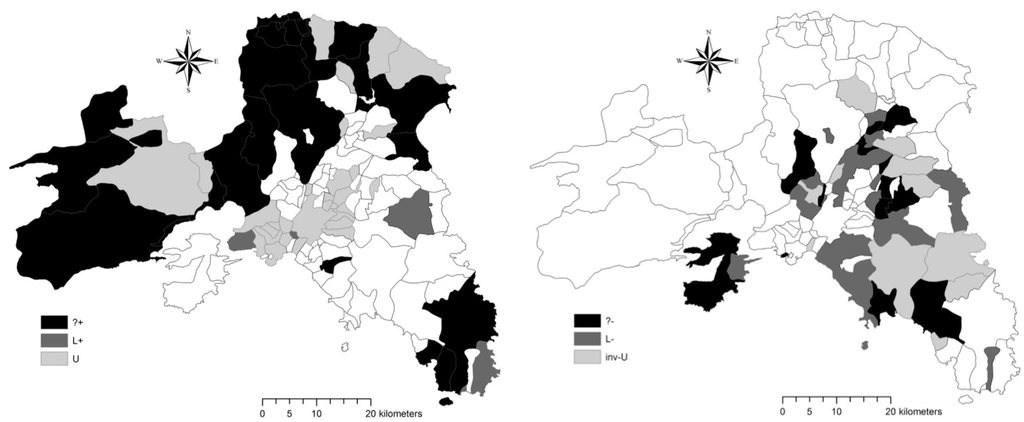 An index of per-capita consumption of land (the ratio of built-up areas to resident population, LUE) has been calculated for each municipality of the study area by decade (1960, 1970, 1980, 1990, 2000 and 2010). Resident population at the municipal scale was derived from the National Census of Population carried out by the National Statistical Service of Greece (NSSG) for each decade (1961, 1971, 1981, 1991, 2001 and 2011). Data on built-up areas were derived from the NSSG land use census for the years 1960, 1970, 1980, 1990 and 2000 and from the Urban Atlas (UA) map referring to 2010 [34]. Built-up area in each municipality of the region was derived for 2010 by overlying the respective land map (UA) with a shapefile illustrating the municipal boundaries using ArcGIS software (ESRI Inc., Redwoods, USA). The analysis domain chosen in the present study allows for a spatial analysis of urban land use during the whole time period, making comparisons possible with external data sources, including statistical datasets derived from official sources.