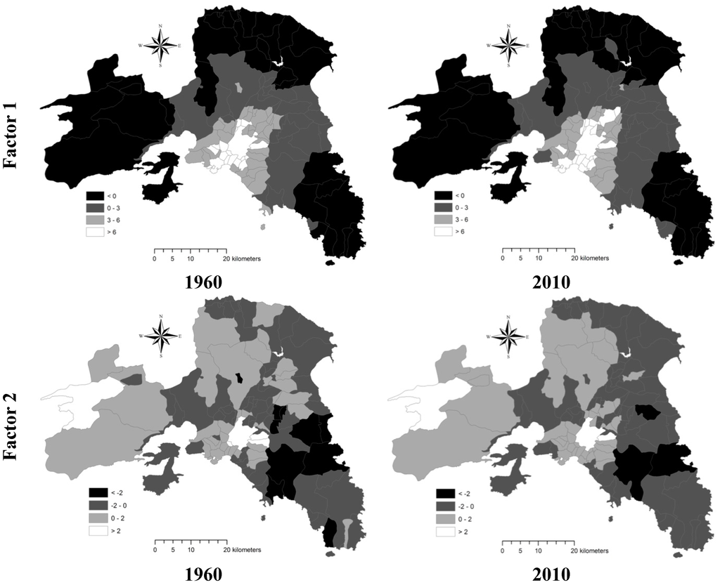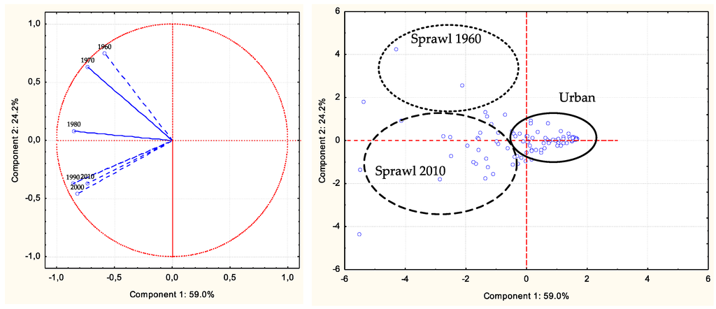 A multivariate framework has been further developed on the same data matrix considering together the LUE indicator observed at any year of study (1960, 1970, 1980, 1990, 2000 and 2010) in a principal component analysis (PCA). The PCA aimed at classifying municipalities into a few homogeneous groups according to the latent LUE spatial patterns [32]. Significant components with an eigenvalue > 2 were analyzed [31]. Component loadings > |0.5| were considered significant. A score plots was prepared for significant components with the aim of highlighting the spatial distribution of each municipality over the factorial plain.