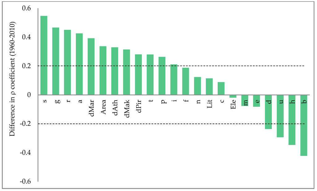 A Spearman rank analysis identifying both linear and non-linear pair-wise correlations was carried out between LUE and each of the 23 indicators, testing for significance at p < 0.05. Bonferroni’s correction for multiple comparisons was also applied. The analysis was developed for each year of study (1960, 1970, 1980, 1990, 2000 and 2010) with the aim of assessing significant relations between territorial indicators and land use efficiency.
