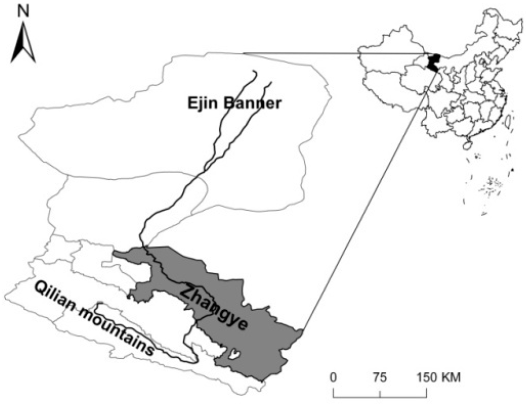 The Heihe River is located in the central part of the Hexi Corridor, northwestern China. The core study area is Zhangye City of Gansu province, located in the middle stream and part of the upstream of the Heihe river basin (Figure 1). It accounts for 92% of the population, 95% of the farmland, 83% of the GDP and 80% of the water consumption of the Heihe river basin.