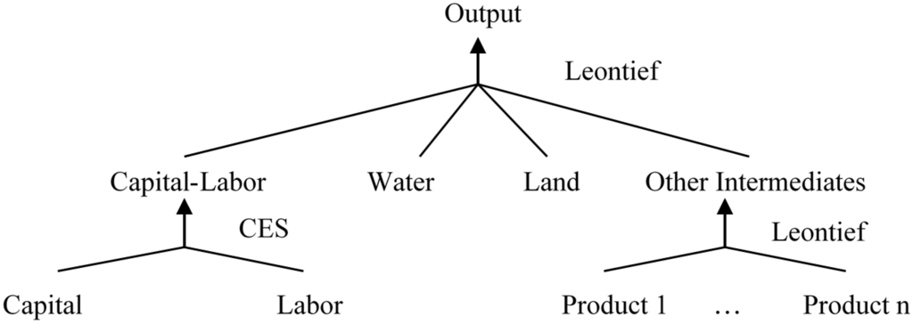 Water was treated as a necessity for every sector’s production in the CGE model. Each sector’s production has its own ratio to its water consumption (i.e., water use per unit of output as shown in Table 1). Therefore, the competition for water is directly related to each sector’s production. A sector’s water consumption increases/decreases with this sector’s production.