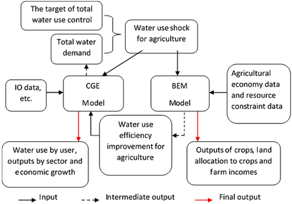 Total water use control can induce changes in the agriculture planting structure and raise the water use efficiency in the sector, which further influences the production of agriculture and other sectors. By linking the CGE and BEM models with the water use efficiency change, the impacts on economic development caused by total water use control can be evaluated.