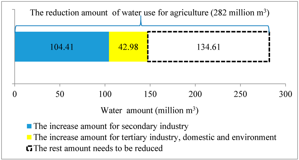 The implementation of total water use control facilitates a speed-up of the transition of water from agriculture to other users. Compared with the year 2010, the water use for agriculture needs to be reduced by 282 million m3, or 13.78%, in 2020. Of this total amount of reduction in agriculture, 104.41 million m3 goes to the secondary industry, 42.98 million m3 to tertiary, domestic and environment, and the remaining 134.61 million m3 is the amount which must be reduced to meet the target of total water use control of 2250 million m3 (Figure 4). This transition greatly improves the total output values of water use in the region, as the secondary and tertiary industries can generally produce more output value with the same amount of water.