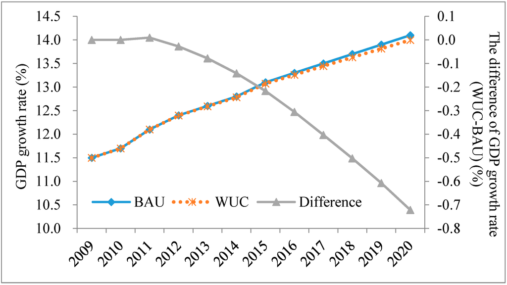 The economic development prospects of Zhangye under the two scenarios are presented in Figure 5. In the BAU scenario, during 2011–2020, the economic growth of Zhangye could get a double-digit rate every year and in 2020 it reaches 14.1%. In the WUC scenario, the economic growth rate still accelerates but not as quickly as that in the BAU scenario. Furthermore, the gap of the GDP growth rate between the BAU scenario and WUC scenario widens slightly over the years because the reduction of water use for agriculture increases over times under the WUC scenario compared with the BAU scenario as shown in Figure 5. For example, in 2015, the growth rate of GDP under the WUC scenario is 0.22% lower than that under the BAU scenario, compared to 0.72% in 2020. Nevertheless, the average annual growth rate of GDP of Zhangye is still high during 2011–2020. As a whole, the impact of total water use control on economic growth rate is limited, which adds to the feasibility of implementing total water use control.