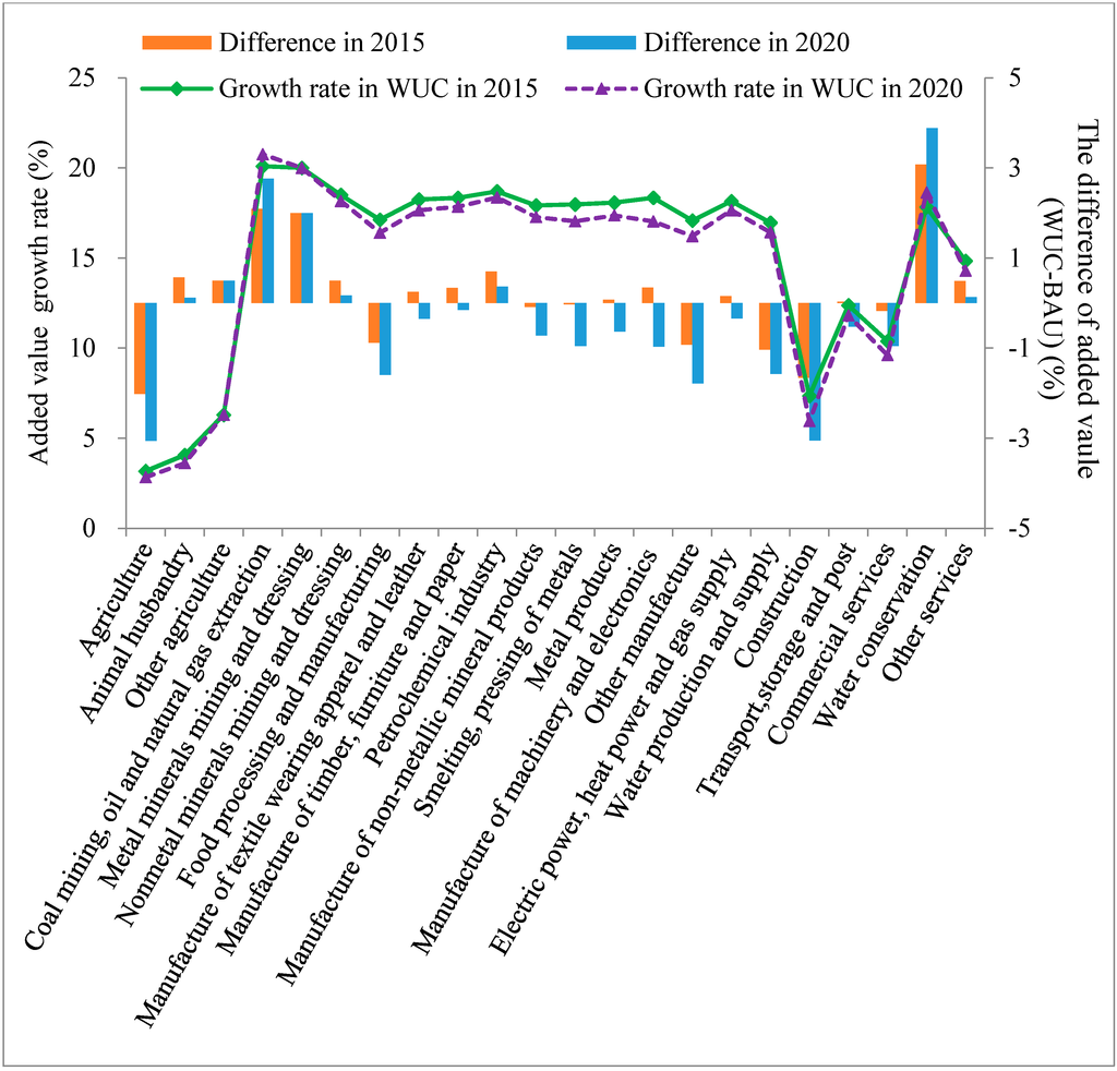 Growth rates of added value by sectors of Zhangye under the WUC scenario and comparisons with the BAU scenario.