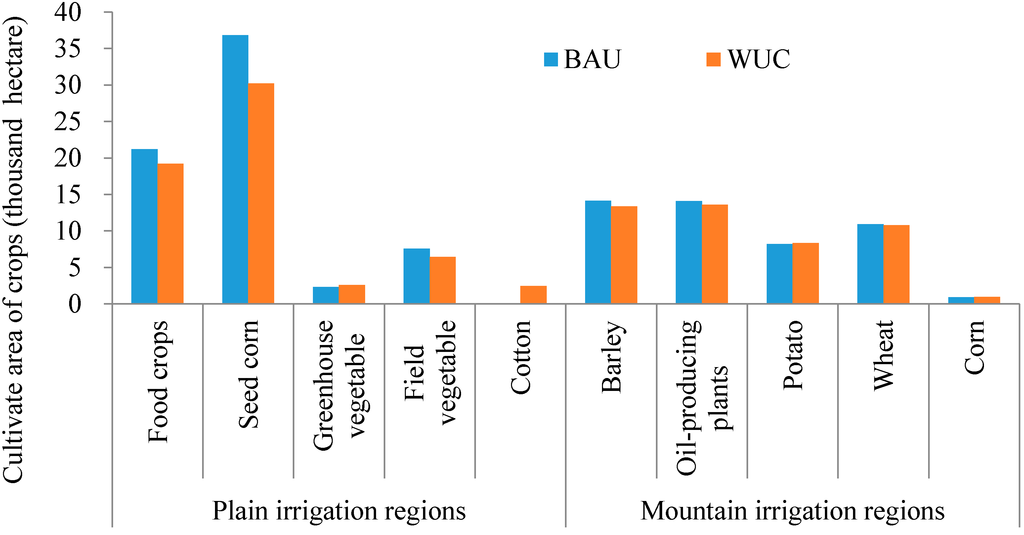The total cultivated land in the BAU scenario is 126.97 thousand hectares, whereas it is reduced to 119.16 thousand hectares with a net loss of 7.81 thousand hectares, or 6.2%, in the WUC scenario (Table 6). This result is not surprising as there is not enough water to support cultivated land. Responding to the reduced water, farmers changed their agriculture planting patterns substantially in order to more efficiently use the available water (Figure 7). In the plain irrigation regions, the cultivated area of food crops, seed-corn, and field vegetable decreased by 9%, 18%, and 15%, respectively. In contrast, the cultivated area of greenhouse vegetable increased by 11%, and the cultivated area of cotton increased from zero to 2.48 thousand hectares. In the mountain irrigation regions, the cultivated area of barley, oil-producing plants, and wheat decreased by 5%, 3% and 1%, respectively, while potato and corn increased by 2% and 7%, respectively. On the whole, the crop structure has been adjusted by using water-efficient crops to replace water-intensive crops.