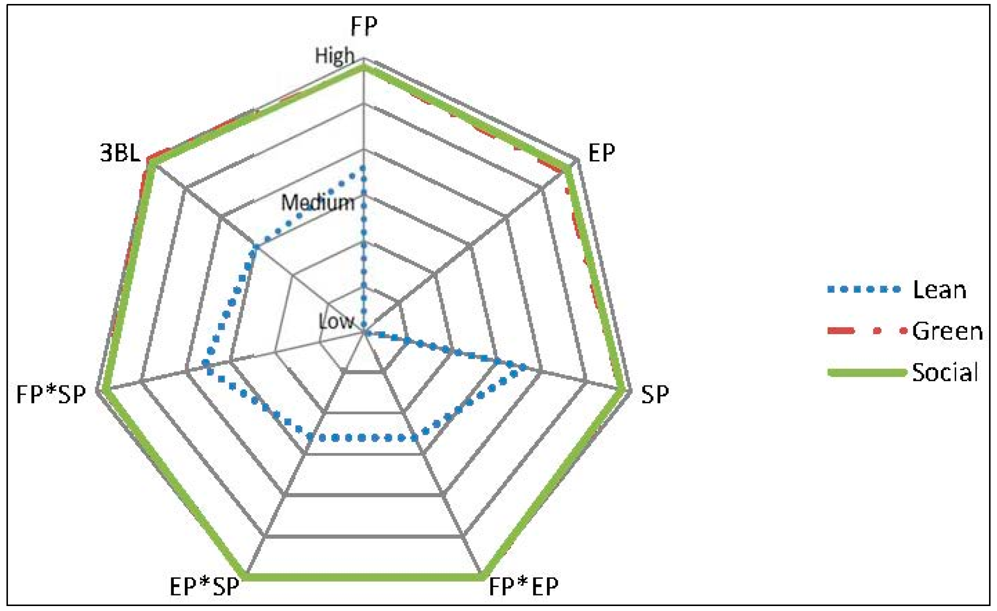 As Figure 1 indicates, the relationship between lean practices and 3BL performance is less significant when compared to both green and social practices. The result is consistent with previous findings [14,64]. Yang et al. [14] found empirically that lean manufacturing practices benefit firm financial performance by systematically eliminating waste and variance, while Cusumano [64] suggested that JIT (an important part of lean) increases the environmental burden by making transportation activities more frequent. According to Figure 1, the line for the correlation between lean practices alone and environmental performance reaches the nearest end. Though it indicates a positive relationship between the two, the strength of the relationship is the weakest among all.