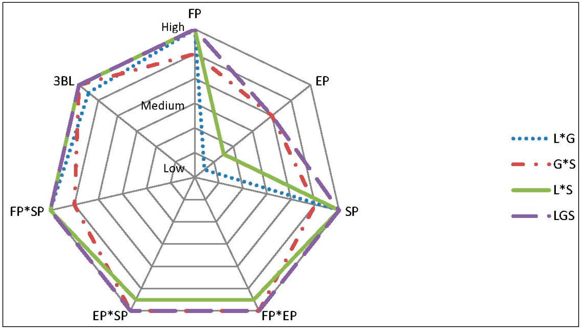 Correlation between possible combinations of LGS practices and performance. Note: * indicates the composite effect.