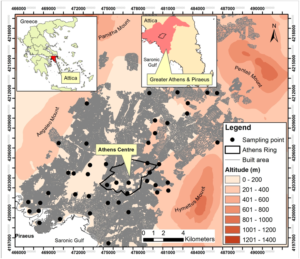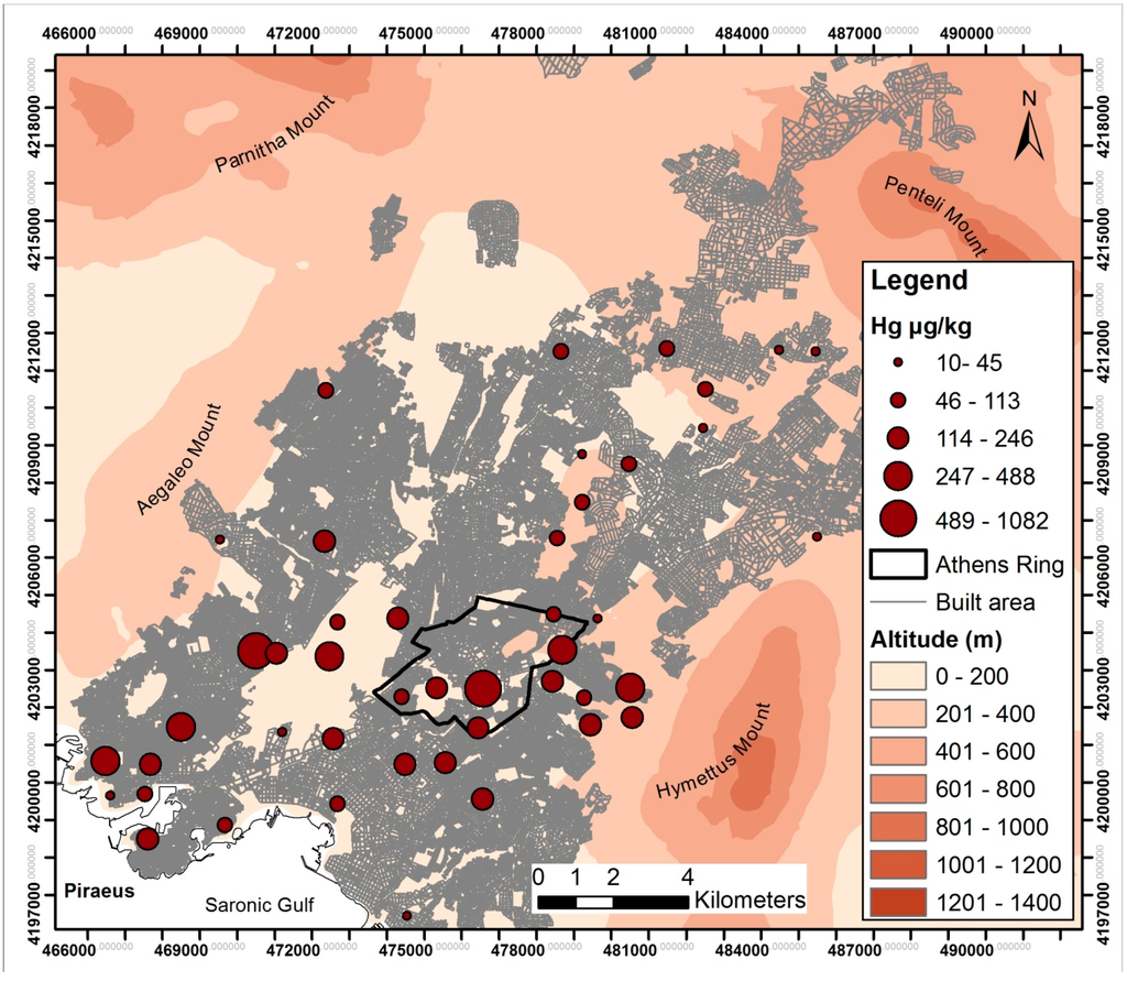 Therefore, the primary purpose of this study is to bridge the gap generated by the lack of knowledge for Hg levels in the Greek soil environment by quantitatively characterizing the Hg content in topsoil samples from the highly urbanized city of Athens, a European Mediterranean city with a very long history. The area has been continuously inhabited for more than 7000 years and provides an example of early urbanization in the ancient world. The city of Athens reached its “Golden Age” during the 5th century B.C. with over 300,000 residents, minted its own coins and had banks, public services and land use planning []. Unlike most European capitals, the urbanization of modern Athens was not related to the Industrial Revolution. Today, the urban area of Athens (Greater Athens and Greater Piraeus) with a population around 3,000,000 over an area of 412 km2 concentrates about one third of the Greek population, as well as a major part of the economic and commercial activities of the whole country. Although there is no large-scale industry in Athens, some commercial activities that could contribute to the increasing of Hg content in soil include silver and goldsmiths, dentistry and inappropriate disposal of batteries.