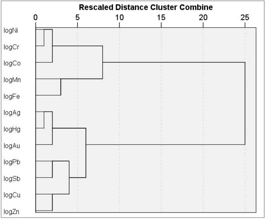 Table 3 presents the correlation coefficients between soil properties and Hg content. A significantly positive correlation was found between TOC and Hg (r = 0.39, p = 0.008). The results of PCA, determined by applying Varimax rotation for metal concentrations in Athens soil, are shown in Table 4. Three principal components (PC) with eigenvalues higher than 1 (before and after rotation) were extracted explaining 81.5% of variance. The first principal component (PC1) explains 43.4% of the total variance and loads heavily on Cu, Pb, Zn, Ag, Au, Hg and Sb. The second principal component (PC2), accounting for 22.8% of total variability, is dominated by Ni, Co and Cr. The third component (PC3) includes Fe, Mn and to a lesser extent Co and explains 15.3% of the total variance. Hierarchical cluster analysis (HCA) is often coupled with PCA to confirm interpretation of geochemical data. The HCA results for the heavy metals studied are shown in Figure 2 as a dendrogram that enabled the identification of two major groups of elements. Group I comprised Cu, Zn, Pb, Sb, Ag, Hg and Au and was clearly distinguished from Group II that consisted of Ni, Cr, Co, Mn and Fe.