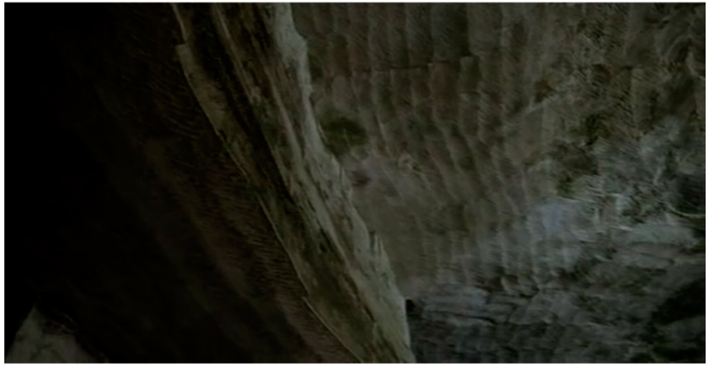 The key moment of the episode “Par condicio” is located in the so-called “latomie” in Ragusa. Latomia means “cut stone” (Figure 11 and Figure 12). These ancient quarries are lithologically composed of tyrrhenian calcarenites: in the SE of Sicily, this kind of stone is very soft and friable, in the local dialect it is called “giuggiulena” (sesame seeds) because they crumble into granules of dimensions similar to sesame seeds. The same rock is elsewhere called “tufo”, a term instead that in geology identifies the pyroclastic rocks.