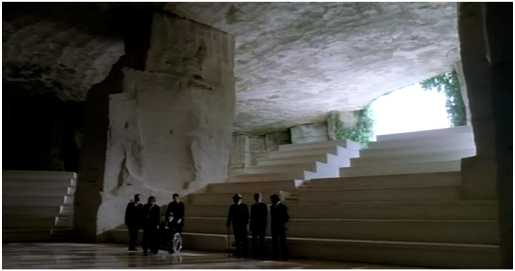 A scene in the latomie (“Par Condicio”): a secret meeting between the oldest bosses of Mafia families [48].