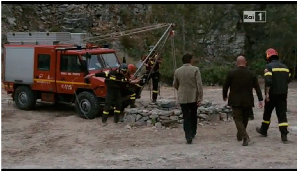 The landscapes that make up the background to the series are spectacular and they assume a significance in the representation of the plot. At the same time, if recognized, understood, and decodified in their natural history and their value, they become part of everyone’s cultural heritage; it is this cognitive process that activates a virtuous cycle that revitalizes the ties between humanity and the environment and fosters a more creative participation from everybody for a balanced management of territory and sustainable development, an important resource in these times of crisis (we are thinking of tourism and its potential in geotourism, ecotourism, etc.). Another reason in choosing this particular TV series is the presence of Cesare Bocci [44,45], the actor who plays the role of deputy to Inspector Montalbano, and who has a degree in Geological sciences: this combination suggests a further appeal to the public, as well as an authoritative contribution to the potential of the filmic communication in the popularization of the natural and cultural heritage (Figure 5). Character, actor and geologist; the coexistence of these roles in a single figure coincides with the definition of “interpreter”, a new way in the mediation between nature and culture in a landscape perspective approach. Thanks to the constant presence of a familiar and competent figure that is able to guide the public through the places that set the backdrop for the series, a journey through landscape becomes a journey through the Earth sciences [46]. The empirical-experimental approach in the field of communication research shows that identical messages have varying effectiveness depending on if they are attributed to credible sources or not [40].