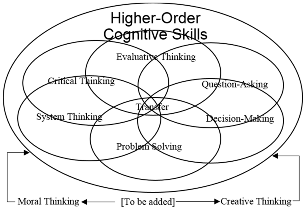 Given the current strive for sustainability and the corresponding paradigms’ shift in science, technology, environment perception, economy and policies—e.g., from unlimited growth to sustainable development—the corresponding paradigms shift at all levels of science, technology, environment, society (STES), science, technology, engineering, mathematics (STEM), and environmental education are unavoidable. A sound, meaningful and coherent science and education for ensuring global sustainability requires a revolutionized change in the guiding philosophy, rationale, and models of our contemporary thinking, behavior, and action [5,6,7,8,9,10,11]. The related development of students’ “sustainability thinking” in the science, technology, environment, society, economy and policy (STESEP) education, requires the development of higher-order cognitive skills (HOCS) such as question asking, system-, critical- evaluative thinking, problem solving, decision making as well as moral thinking, creative thinking and transfer (Figure 1) in these contexts [5,9,10,11].