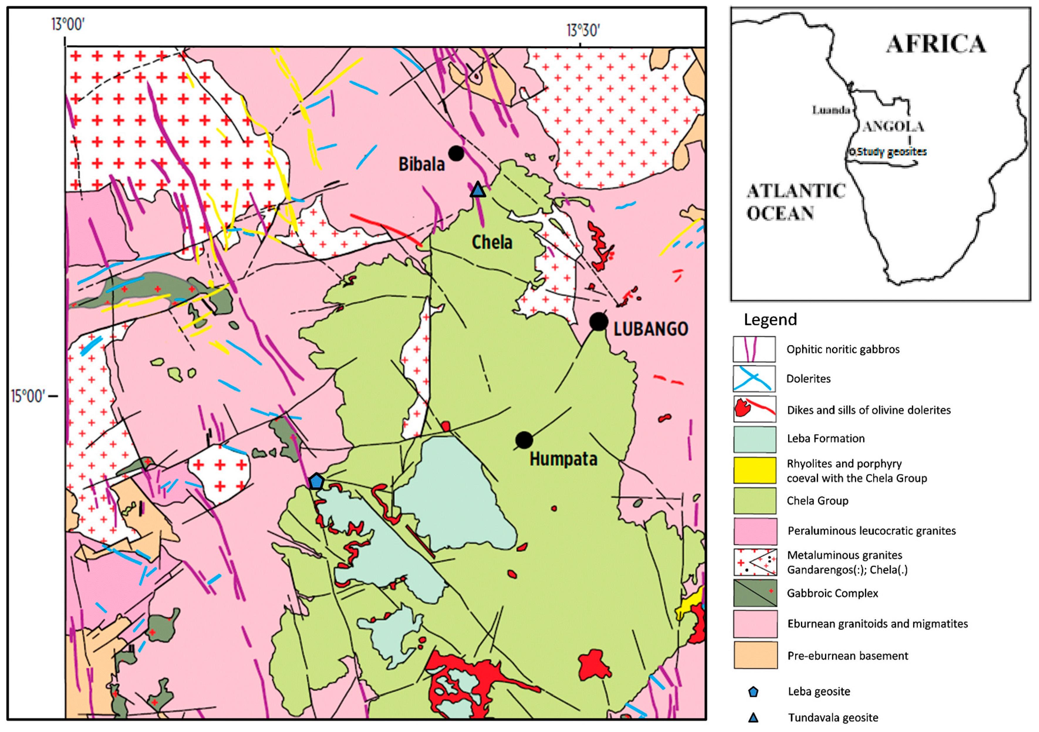 Geological map of Huíla and Namibe Provinces (southern Angola) indicating the location of the Tundavala and Leba geosites. Reproduced with permission from the authors [