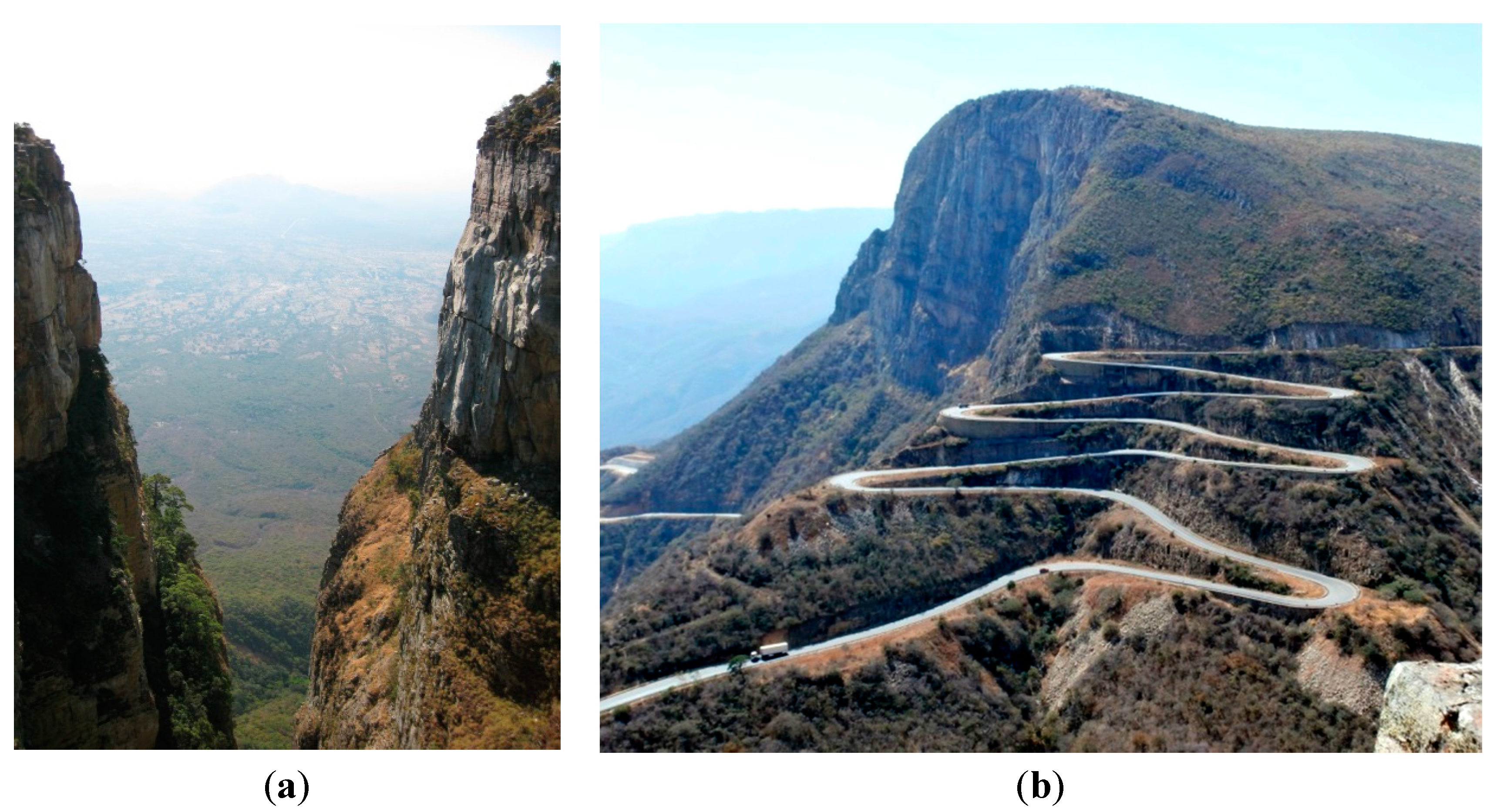 The most popular views of the Tundavala and Leba geosites. (a) The Tundavala Gorge observed from the belvedere; (b) the Leba cliff observed from the belvedere.