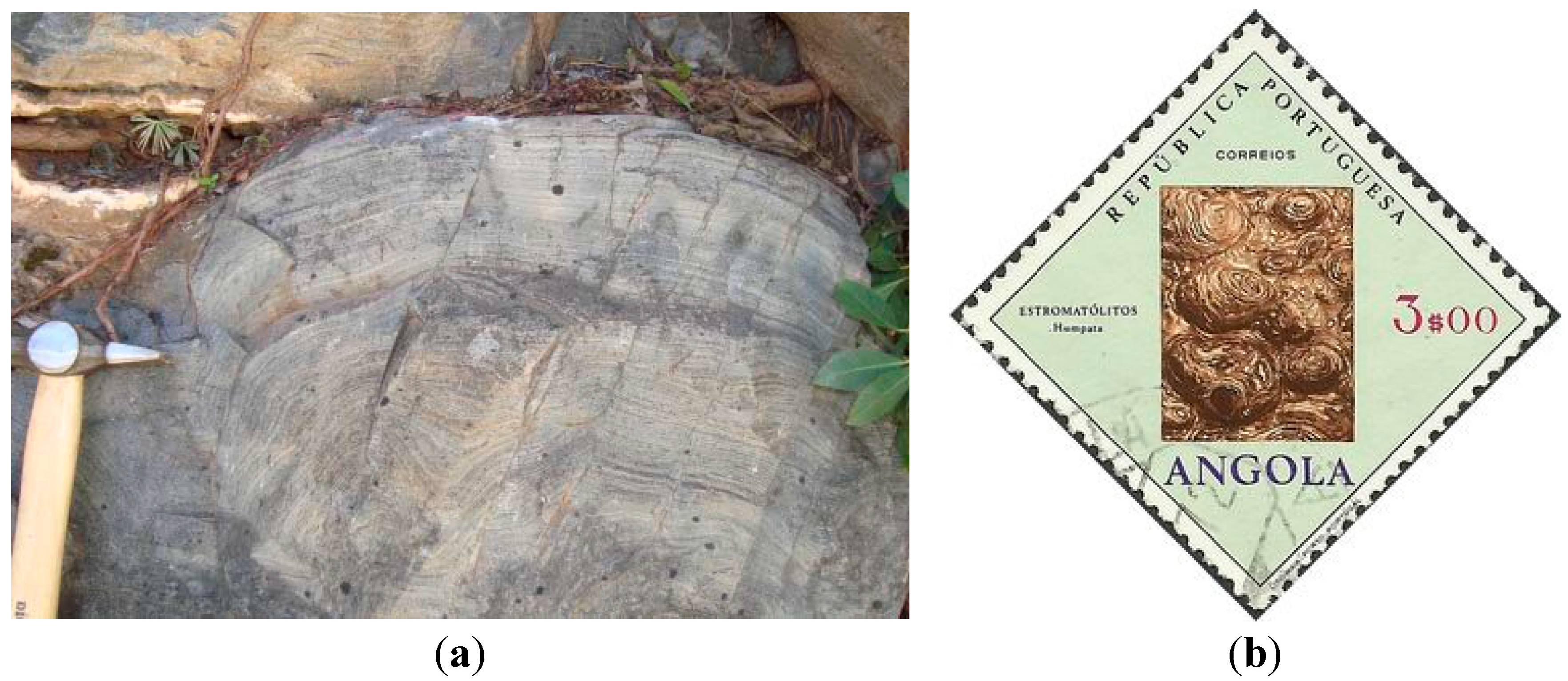 Stromatolites of the Leba Formation: (a) laterally-linked hemispheroids displaying spaced lateral linkage in the outcrop (LLH-S-type stromatolites); (b) spherical structures in the philatelic record (SS-type stromatolites) included in a commemorative collection of the Portuguese Post on the geology of Angola, issued in 1970.