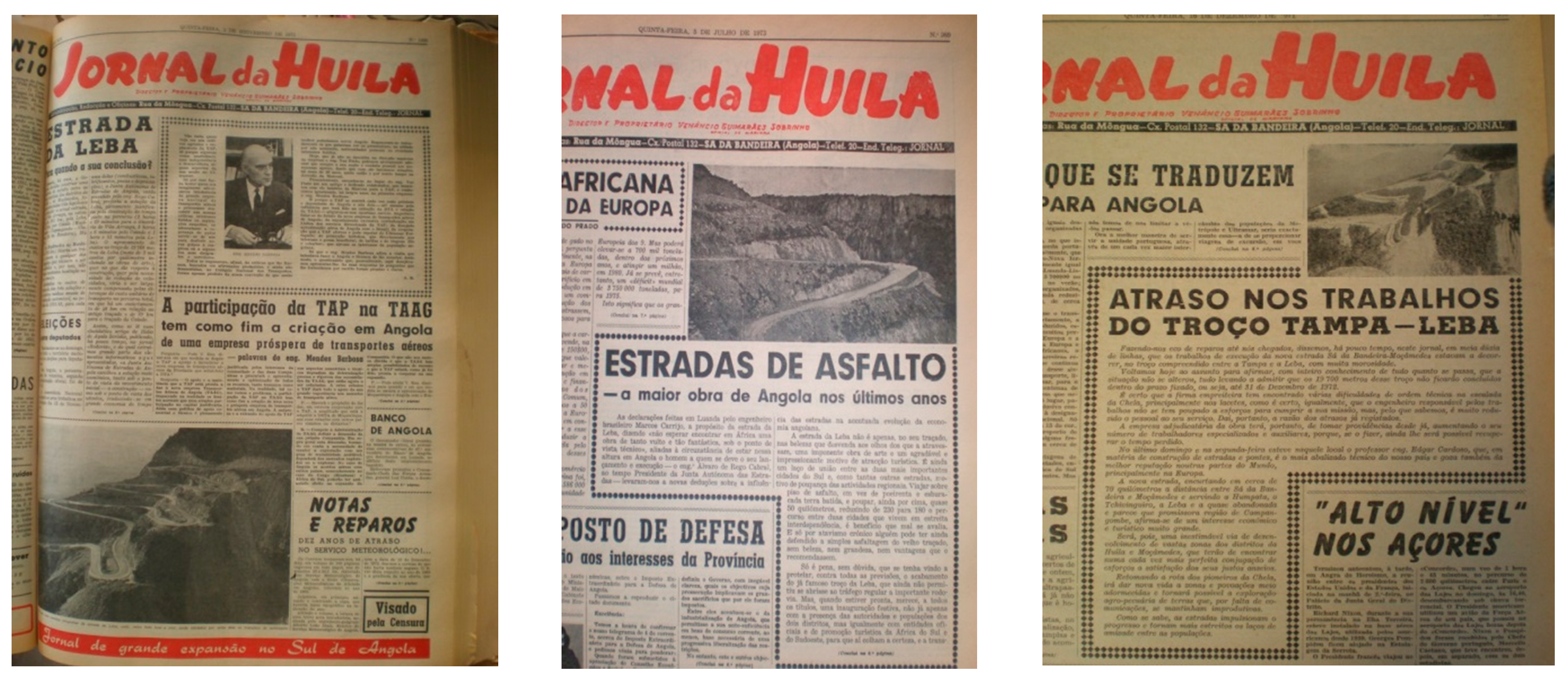 Front pages of the weekly newspaper “Jornal da Huíla”, showing the social relevance assigned to the construction of the EN 280 road (1969–1975).
