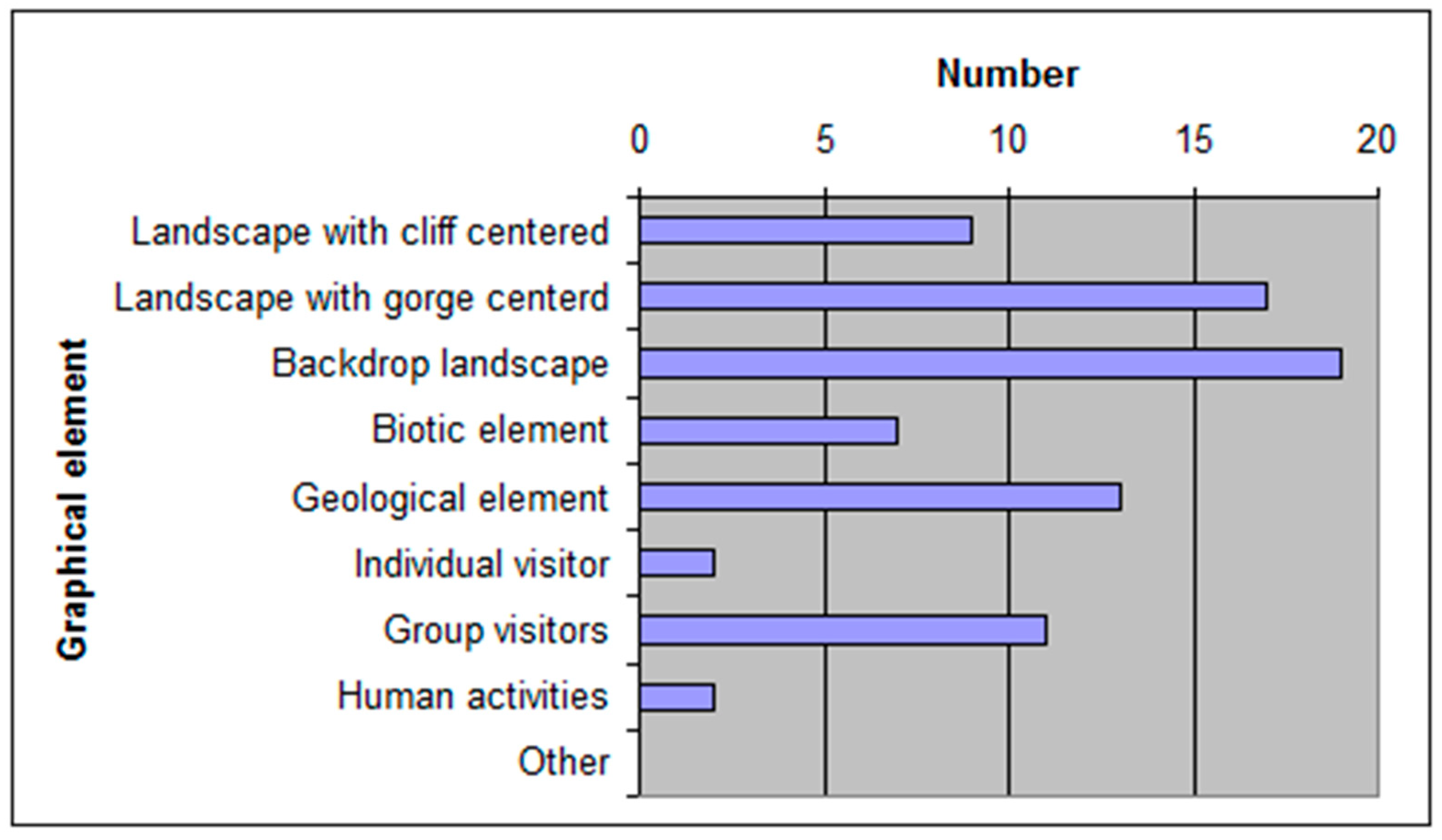 6]. The analysis of the graphical elements included on web pages underlines the photographic representation (45 records), movies (26), animation (eight) and schemes (one), the landscape being the most represented feature, followed by particular geological or geomorphological elements and visitors’ activities (