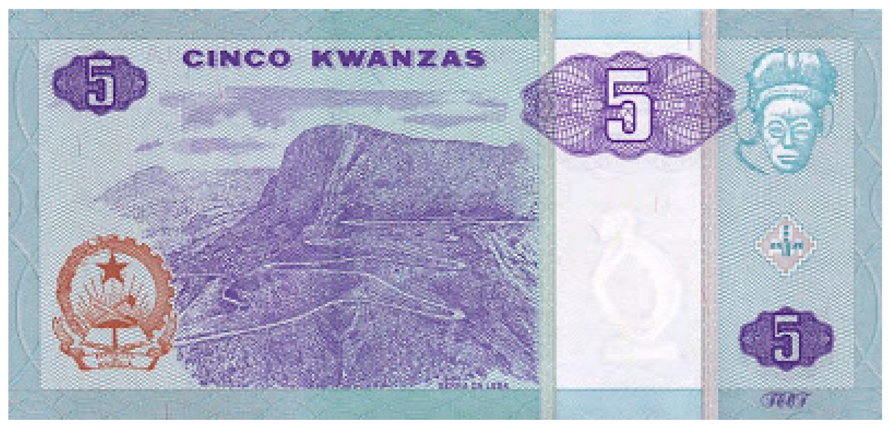 Notaphilic five kwanza item issued by the National Bank of Angola, showing the Leba cliff and the EN 280 road.