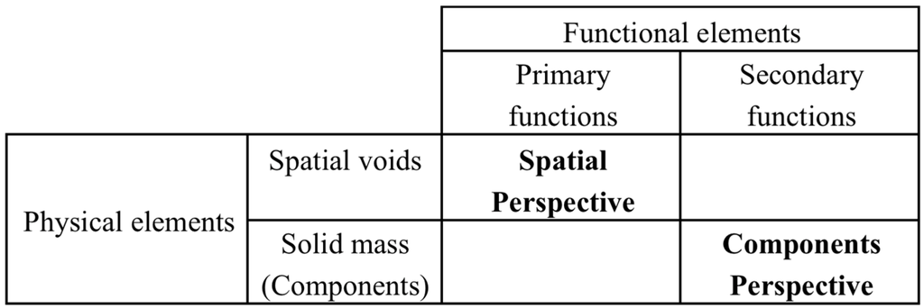 Although spatial voids and solid mass are complementary, the product architecture could be conceived in terms of solid mass (components perspective) or spatial voids (spatial perspective). In fact, each of these perspectives embodies a different type of allocation scheme. From a spatial perspective, the focus is on the primary functions performed by people in the spatial voids (Figure 1). However, these functions still need to be allocated to some extent into solid mass, as these are needed to create the spatial voids. In a components perspective, the focus is on the allocation of secondary functions into solid mass (Figure 1).