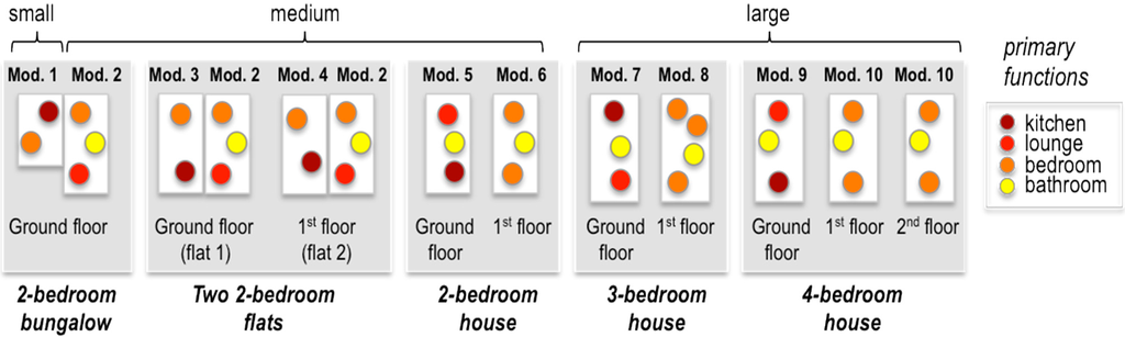Both components and spatial product architecture perspectives were considered in each case study. The components perspective is not novel, as it is described in most product modularity studies in manufacturing. This perspective has been previously adopted also in house-building design. For example, the product architecture described by Hofman et al. [4] adopts a component perspective since it involves three module types (columns, exterior walls, and floors) that fulfil secondary functions, and which are mixed and matched to created different building types. Conversely, the spatial perspective has not been widely investigated in house-building. In that perspective, each module involves a wide assortment of interconnected components. Consider for instance the different components needed (e.g., floor, ceiling, walls, fixtures, finishing) to create a module that supports the primary functions associated with a bedroom (e.g., to read, to sleep, to watch TV). In a spatial perspective, modules should involve sizeable portions of the product, resulting in fewer modules and interfaces. These fewer modules and interfaces are beneficial from a production viewpoint, due to the reduction in the number of modules that need to be produced. However, devising a modular architecture defined by a one-to-one allocation scheme and decoupled interfaces can be challenging, because each spatial void requires several components.