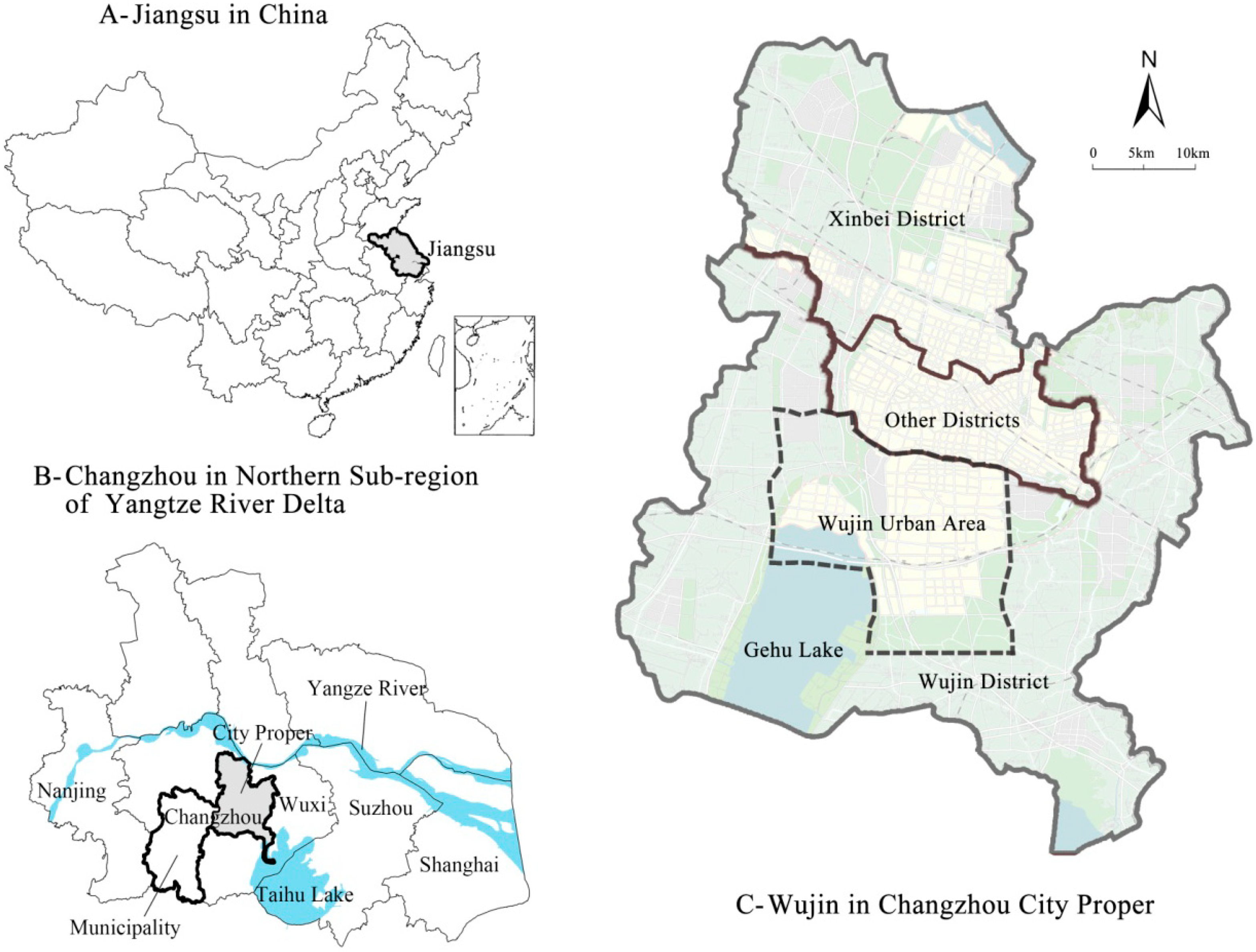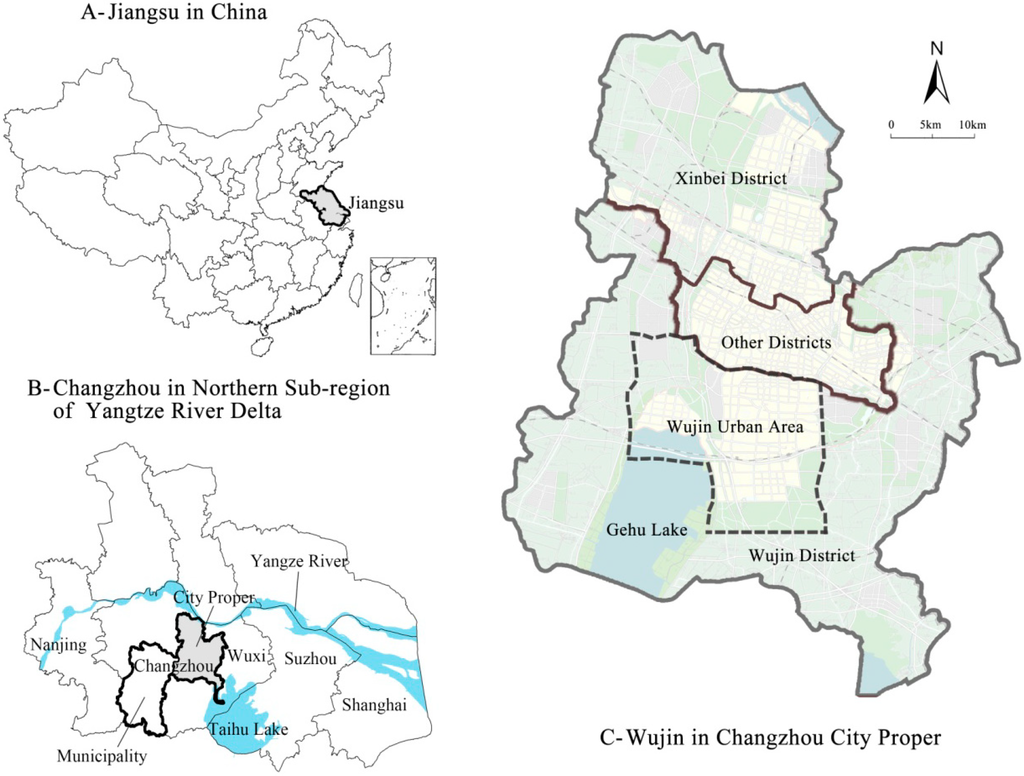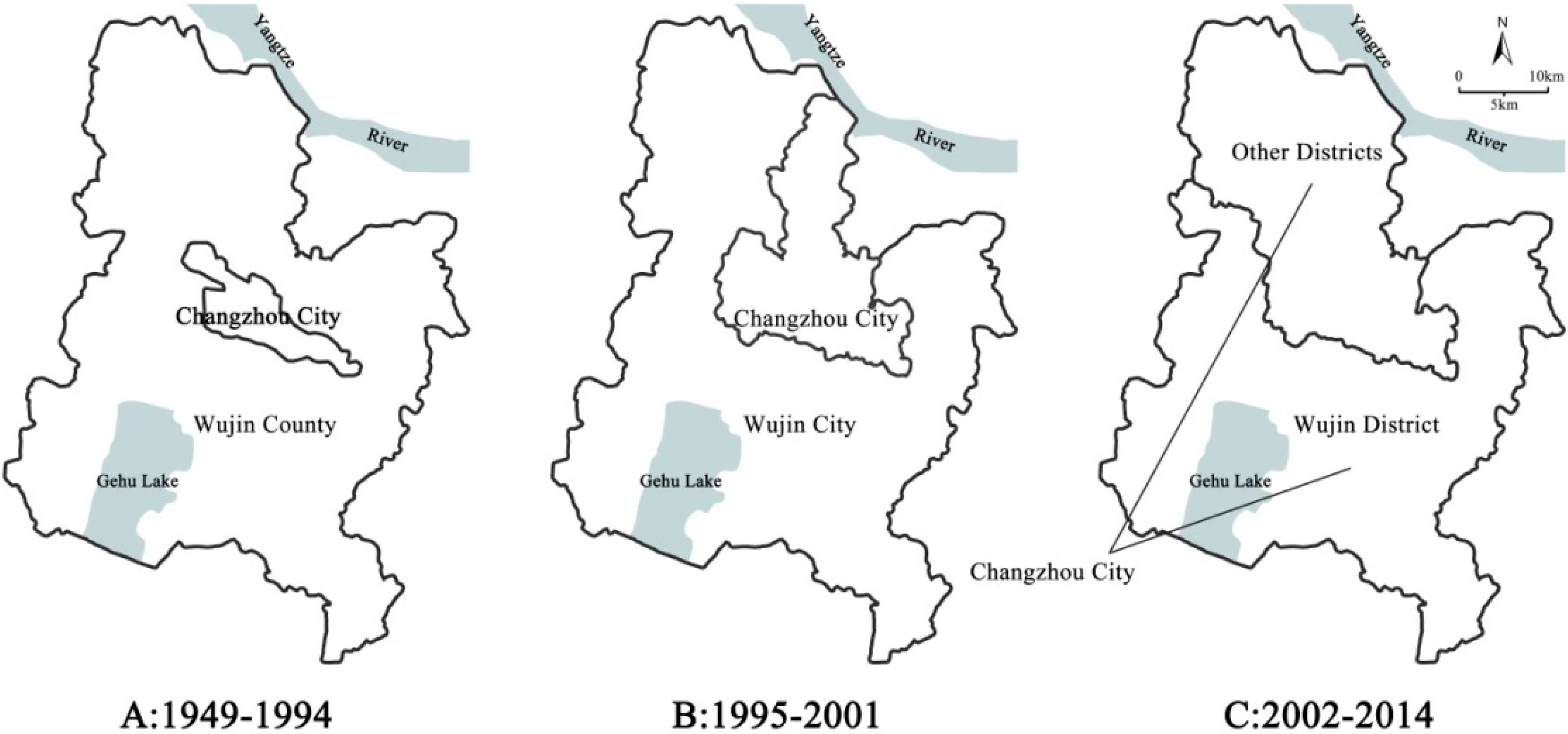 However, after the administration reform in 1980s [37], Wujin County was administered by Changzhou city and the latter was promoted as a prefecture-level city in 1983 under the policy of “system of city governing county” [9,30]. As administered by Changzhou city, Wujin County first relocated its government site from a city to a county town - Hutang in 1993, then was transformed as a county-level city in 1995 (Figure 2B), finally, was merged into Changzhou city as a urban district in 2002 (Figure 2C).