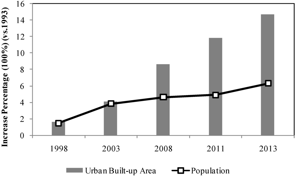 Increase percentages of land consumption and population growth from 1998 to 2013 compared to the data in 1993. Note: data from Wujin County Master Planning Report (1993–2020) [42]; Wujin City Master Planning Report (1998–2020) [48]; Urban Construction Development Report of Wujin Urban Area 2013 [49].