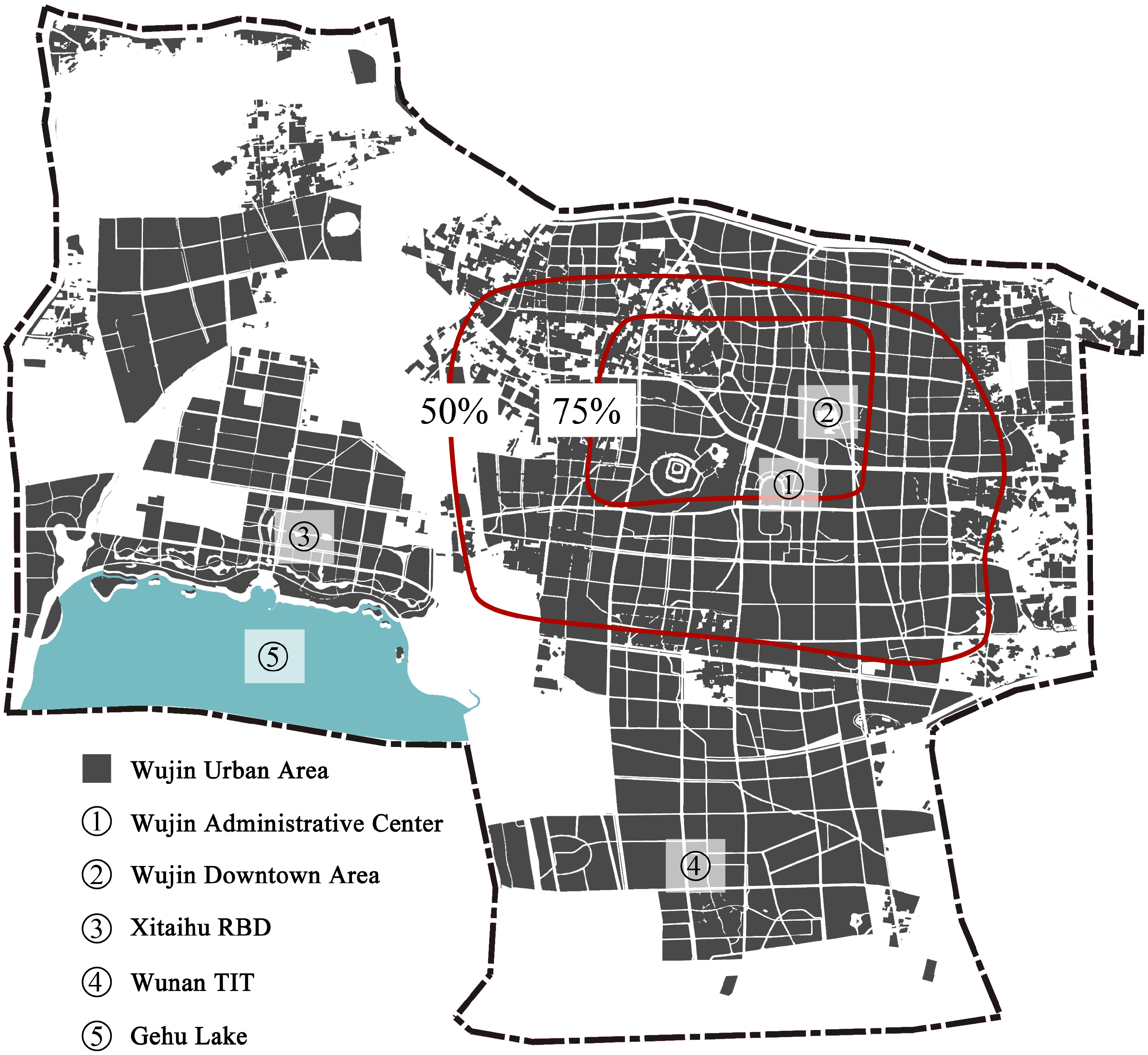This changed objective also stimulated the restructure of city form, formulating a polycentric spatial structure including a recreational business district (RBD) in front of Gehu Lake that is located in the west, and a tech-industrial town (TIT) in the south, as well as CBD in Hutang central area.