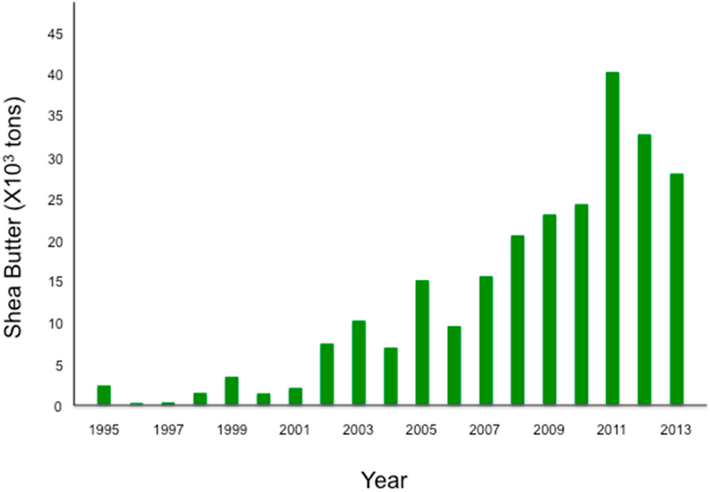 Recent estimates of the total export crop from the region, are as high as 500,000 SETs, sourced from just eight West African nations: Benin, Burkina Faso, Cote d’Ivoire, Ghana, Guinea-Conakry, Mali, Nigeria and Togo [38]. Although up from average annual exports of 170,000 tons a decade ago, the current annual average export is probably closer to 220,000 SETs due to poor harvests, e.g., when meeting contracts was threatened in 2005, 2009/2010, 2012 and 2014, or demand fluctuations.