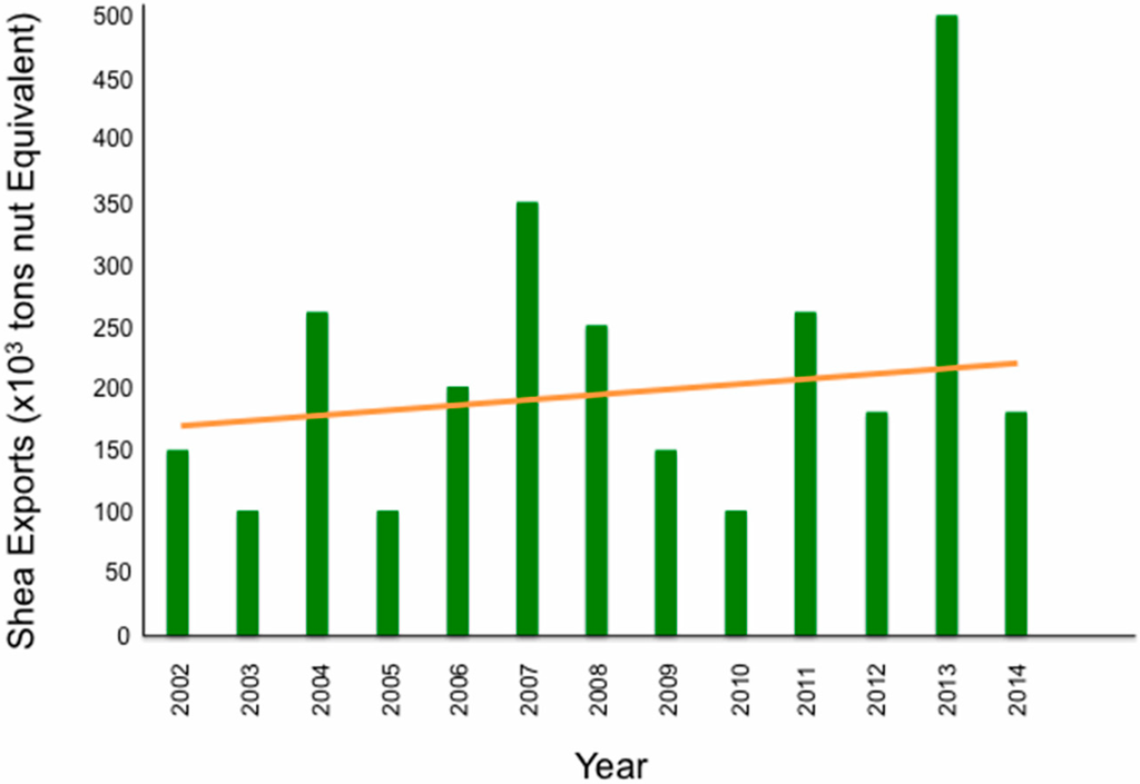 Shea exports in thousands of tons nut equivalent from 2002 to 2014 (with permission from LMC International [39]).