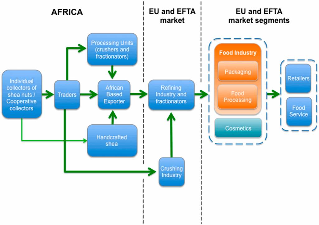Structure of the shea supply chain from Africa to EU markets (with permission from CBI [58]).