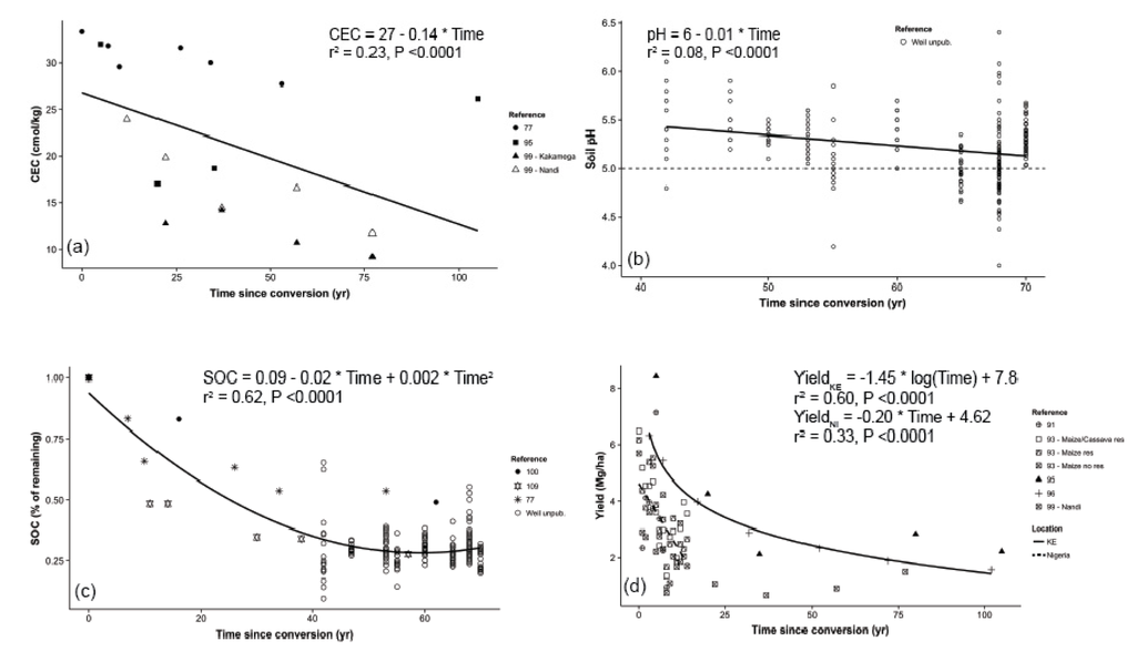 - Nyberg, G.; Bargués Tobella, A.; Kinyangi, J.; Ilstedt, U. Soil property changes over a 120-yr chronosequence from forest to agriculture in western Kenya. Hydrol. Earth Syst. Sci. 2012, 16, 2085–2094. [Google Scholar] [CrossRef]