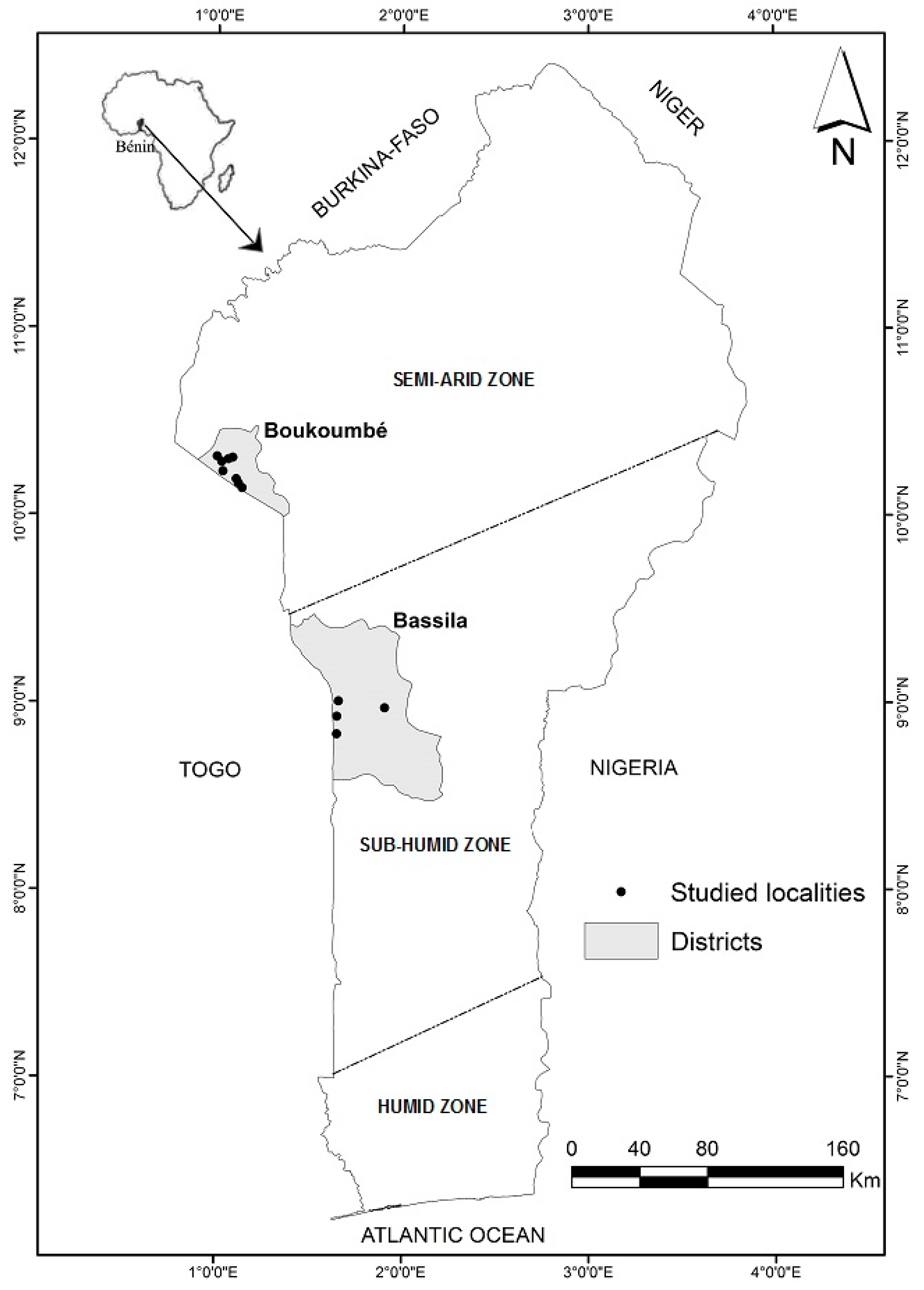 - INSAE. Cahiers des Villages et Quartiers de Ville des Départements de l’Atacora et de la Donga; Direction des Etudes Démographiques, Institue National de Statistique Appliquée et d’Economie (INSAE): Cotonou, Bénin, 2004. [Google Scholar]