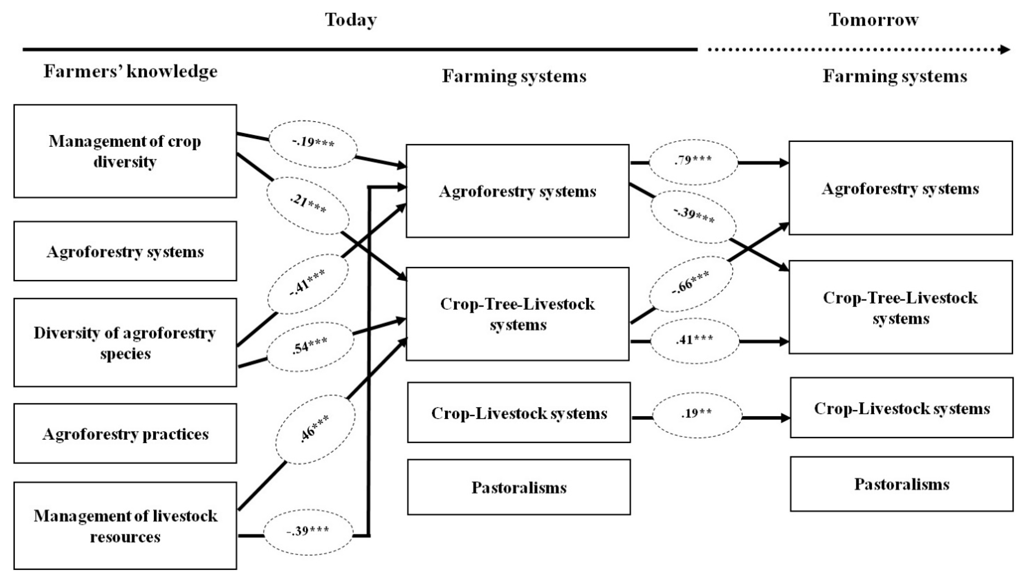 Farmers who were already involved in crop-tree-livestock systems were more willing to apply them in the future (τ = 0.41, p < 0.001, Figure 1), but did not intend to adopt agroforestry systems in the future (τ = −0.66, p < 0.001, Figure 2). This indicates that farmers that are harnessing crop diversity, tree diversity and livestock resources (three components of agrobiodiversity) through an integrated crop-tree-livestock systems do not want or strongly disagree to abandon animal breeding in the future and rely only on crop and tree diversity. Farmers who currently used agroforestry systems were strongly willing to maintain this system in the future (τ = 0.79, p < 0.001), but were not willing to apply crop-tree-livestock systems in the future (τ = −0.39, p < 0.001). Farmers whose current farming system integrates crop diversity and livestock resources were willing to maintain this system in the future (p < 0.01), although this correlation is weak (τ = 0.19). Pastoralists were not willing to maintain this livelihood system in the future (τ = −0.02, p = 0.793), indicating that they are willing to include crop diversity, tree resources or both in their production and livelihood systems.
