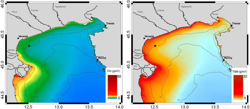 The Po river plume largely affects the deposition of sediments and causes a reduction in salinity from freshwater discharge [,]. Owing to river runoff and oceanographic conditions, the region also exhibits a decreasing trend of nutrient concentration and production from North to South and from West to East [], see the mean concentration of Chlorophyll-a in Figure 3.