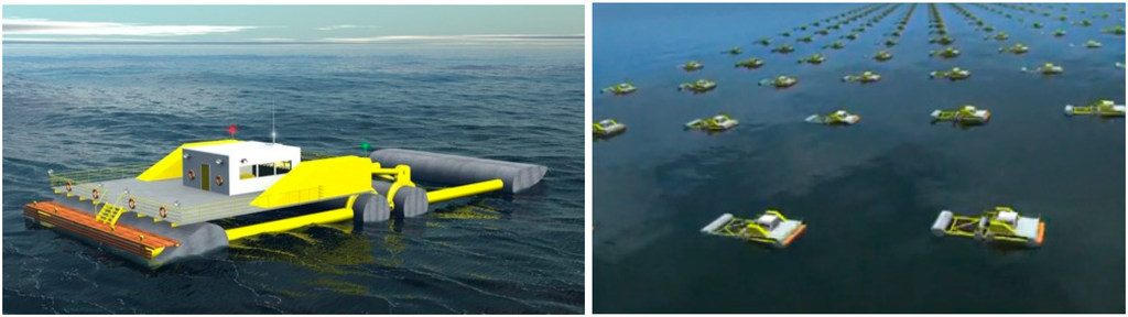 The potential for marine energy is also still far from being realized and used. Offshore, together with onshore, wind energy could deliver, competitively, 2600 TWh of energy, which represents up to 20% of the total demand for electricity in Europe []. Wave, tidal and thermal energy could provide a substantial contribution to the renewable energy production of many European countries. However, costs are still high, especially for immature technology, i.e., wave energy extraction, due to the limited energy conversion efficiency, unreliable moorings, and survivability of the devices [,].