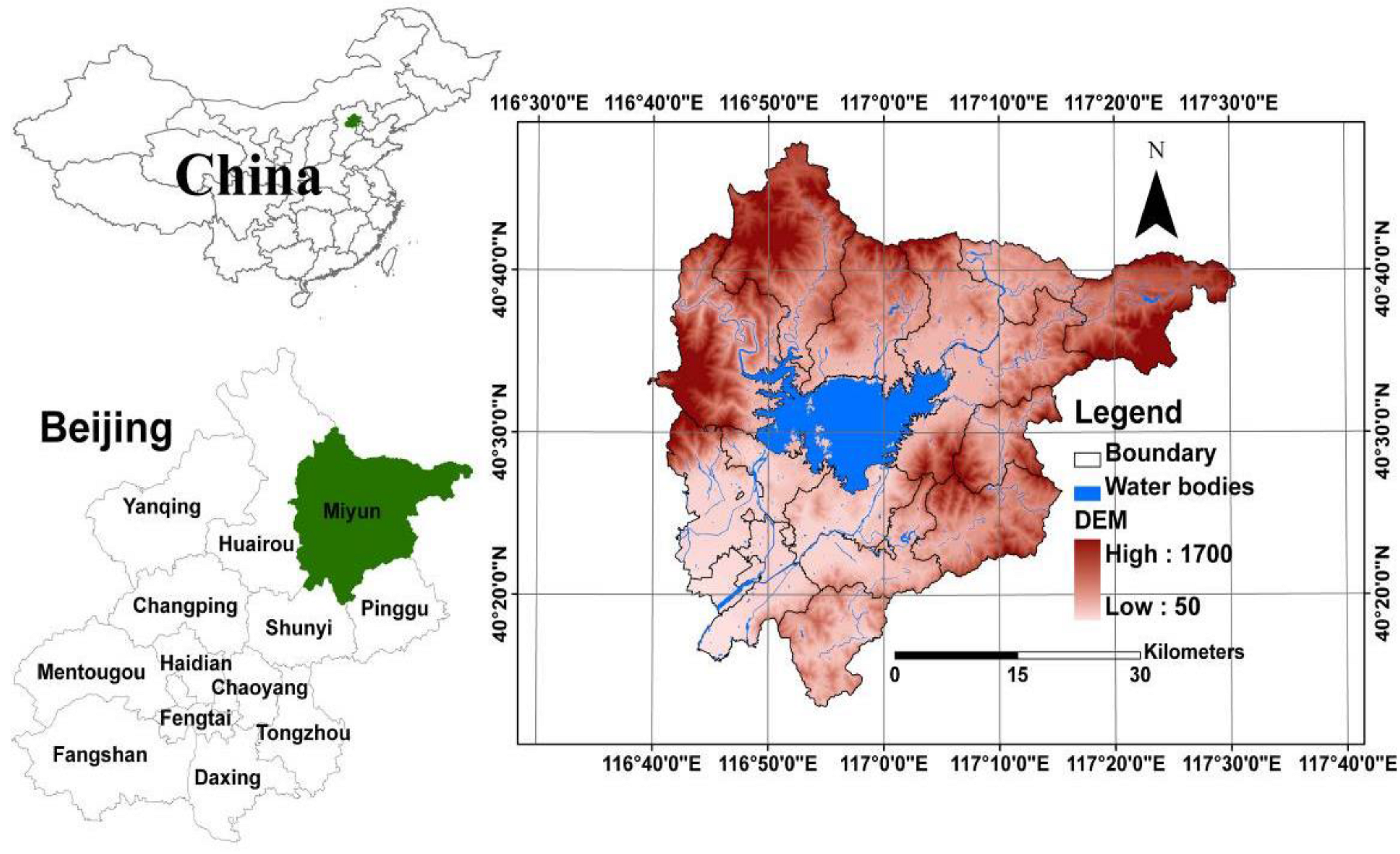 Miyun County, which is located in the northeast of Beijing (116°65′E–117°5′E, 40°2′N–40°8′N), is the largest county in Beijing, China (Figure 1). The area of Miyun is 2229.45 km2, accounting for 13% of the area of Beijing. Its average annual precipitation is 661.3 mm, with an average annual temperature of 10.8 °C. It is an important source of drinking water and ecological conservation area of Beijing. As the biggest reservoir in north China, Miyun reservoir was built in 1958–1960, and is located in the middle of Miyun County. Its forestry ecological coverage rate reaches 62.3% of county, and the wet index and water density rank the top of the city. By the end of 2012, it had a population of 0.47 million people.