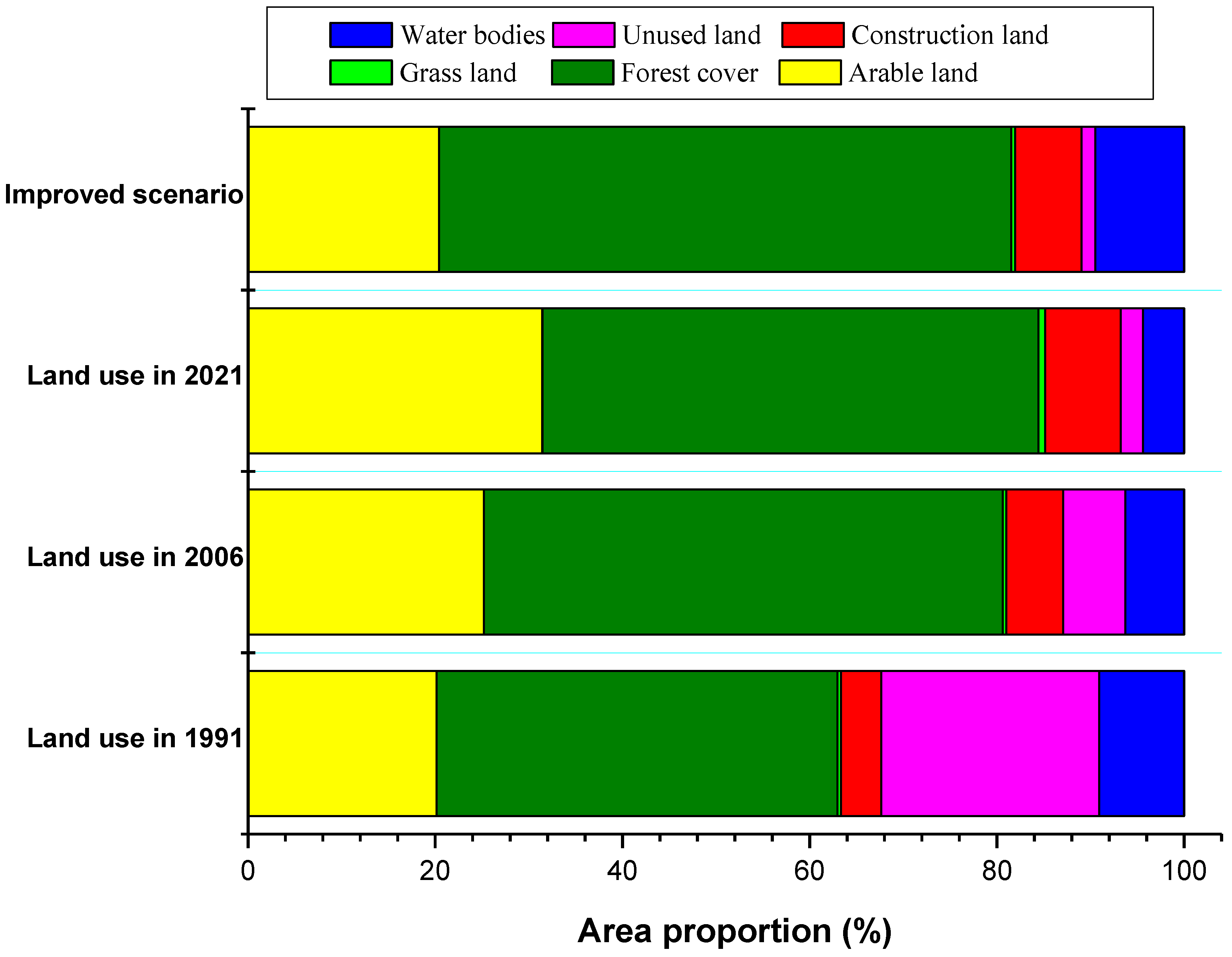 Overall, the total ecosystem service value of different land use types with respect to the coefficient of sensitivity changes of ecosystem service value is less than 1, which indicates that the total ecosystem service value is relatively inelastic. Coefficients of sensitivity for forest cover, water bodies and arable land are relatively larger, of which the coefficient of sensitivity for forest land is the highest, i.e., 0.62 in 1991, 0.72 in 2006, 0.73 in 2021 and 0.70 under the improved scenario, due to the large area and high ecosystem service value coefficient. Besides, the coefficient of sensitivity for water bodies is the second largest, i.e., 0.28 in 1991, 0.17 in 2006, 0.14 in 2021 for arable land and 0.12 in the improved scenario for unused land; while that for unused land is the least, i.e., 0.01 in 1991, 0.00 in 2006, and 0.00 in 2021 for grass land, and 0.00 under the improved scenario for grass land, due to the low ecosystem service value.