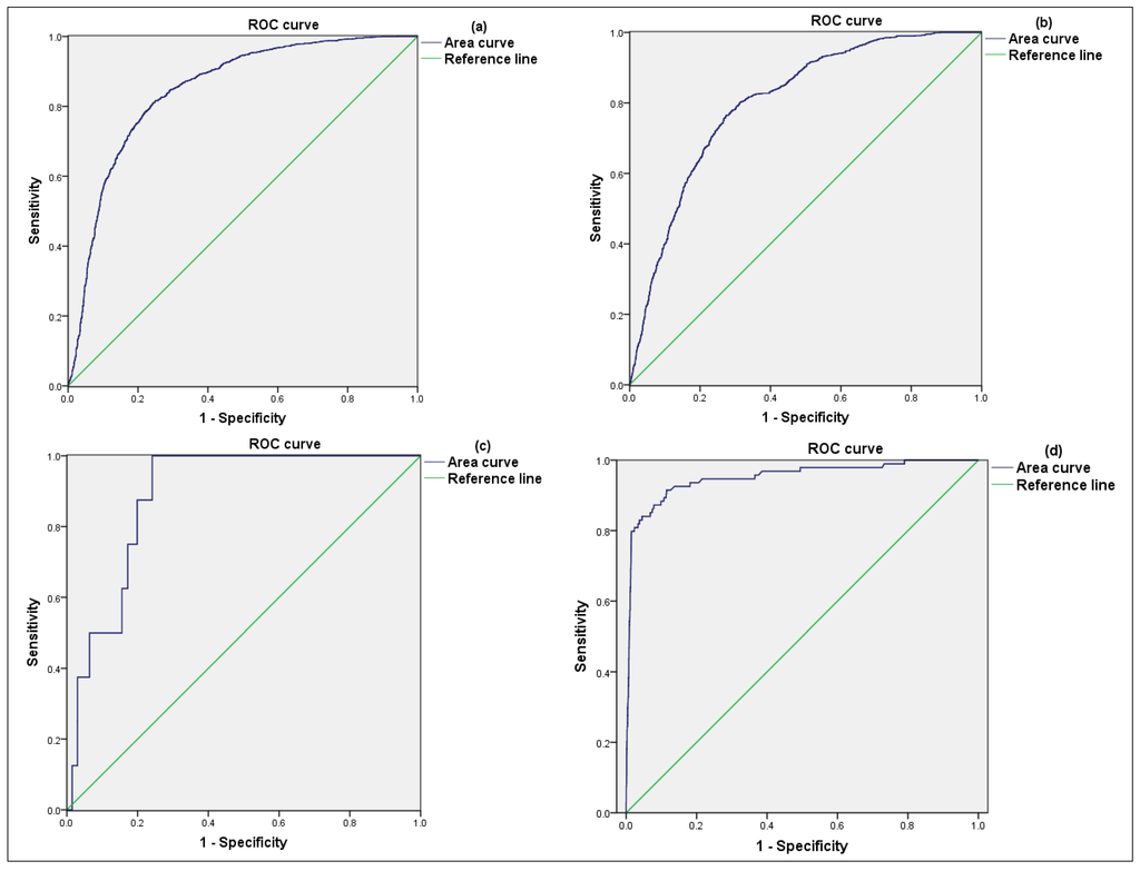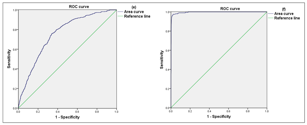ROC value of each land use type. (a) Arable land; (b) Forest cover; (c) Grass land; (d) Construction land; (e) Unused land; (f) Water bodies.