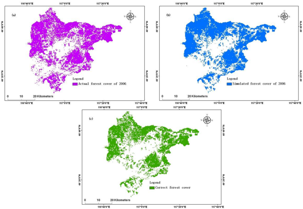 CLUE-S model validation (In forest cover, for example). (a) Actual forest cover of 2006; (b) simulated forest cover of 2006; (c) correct forest cover.
