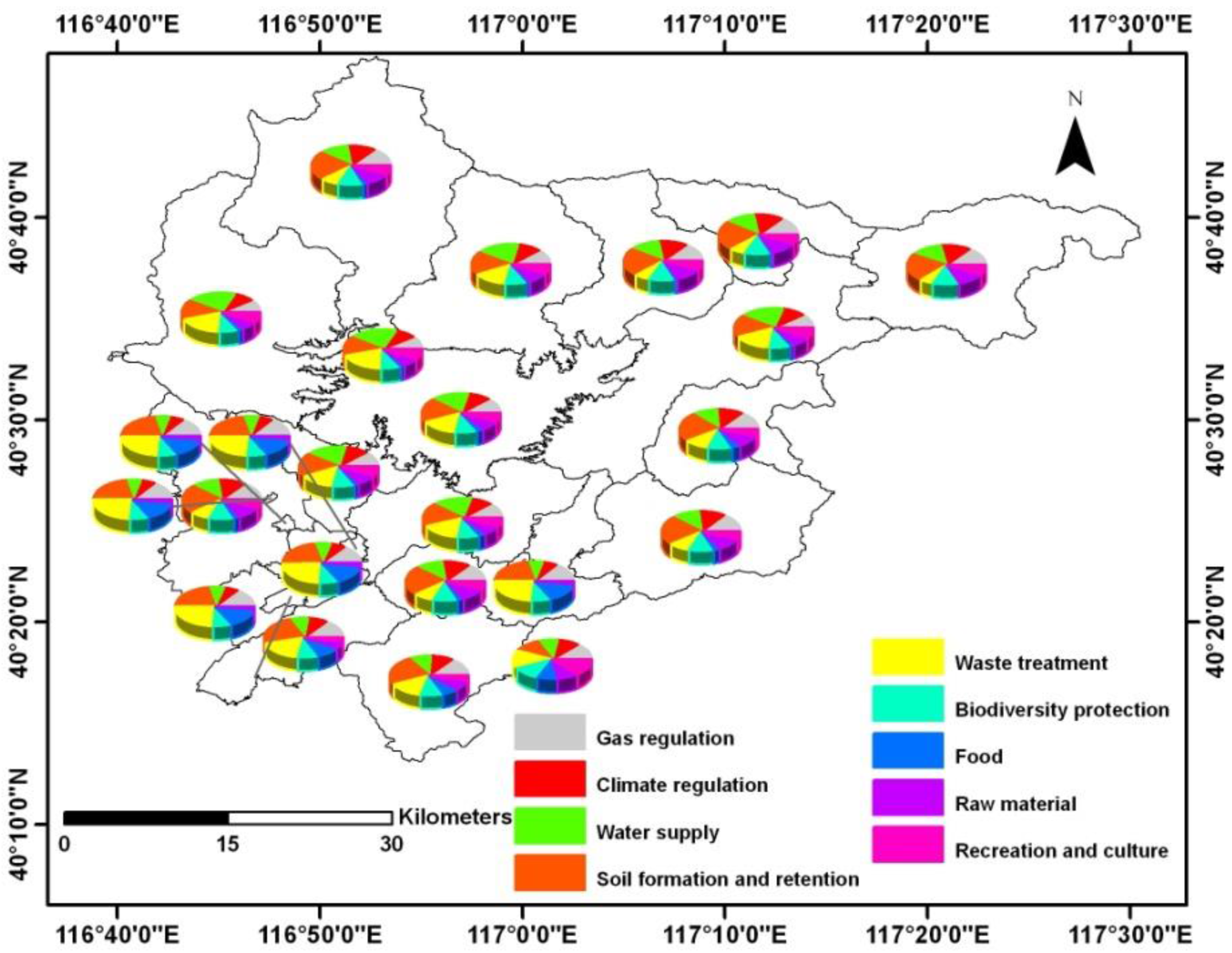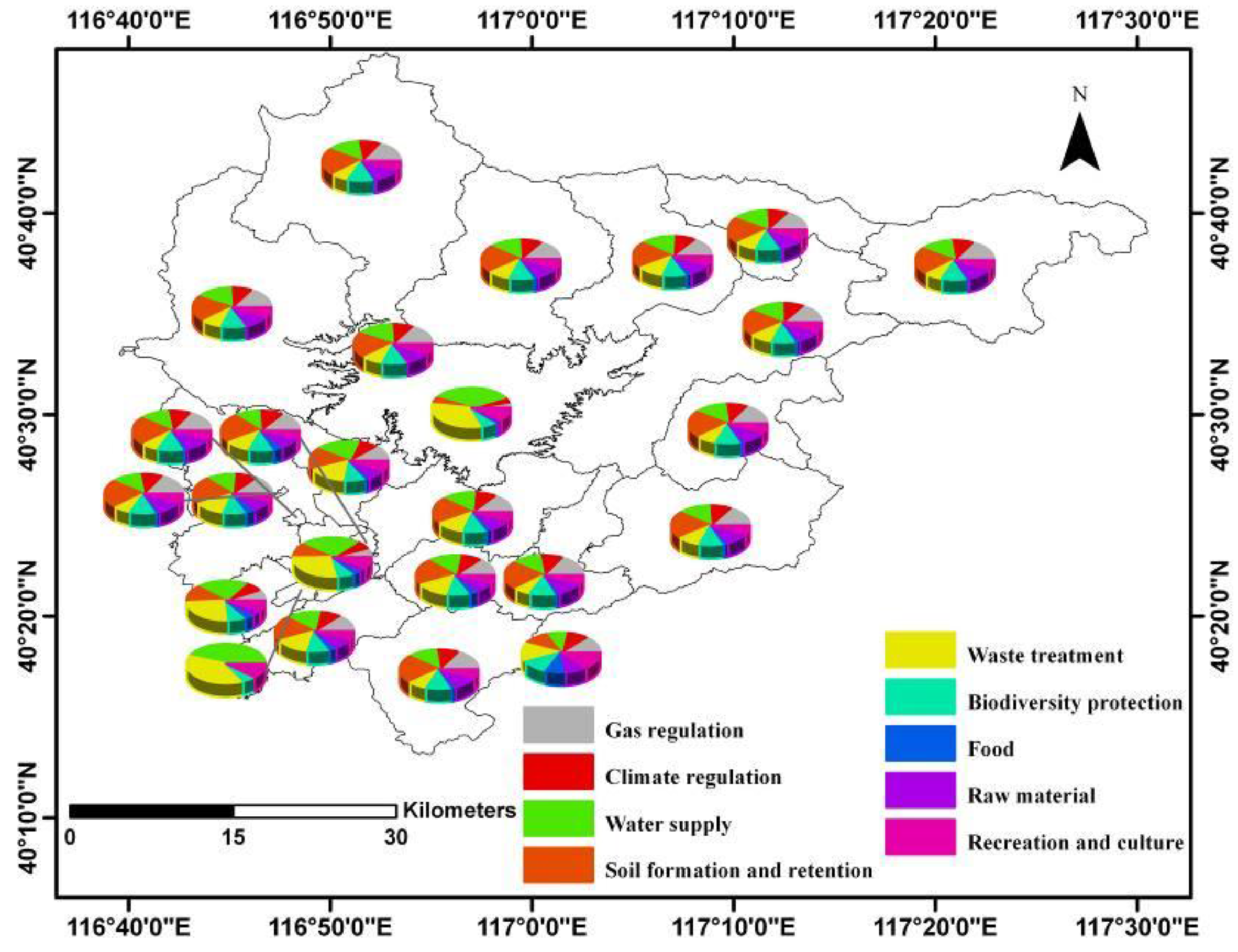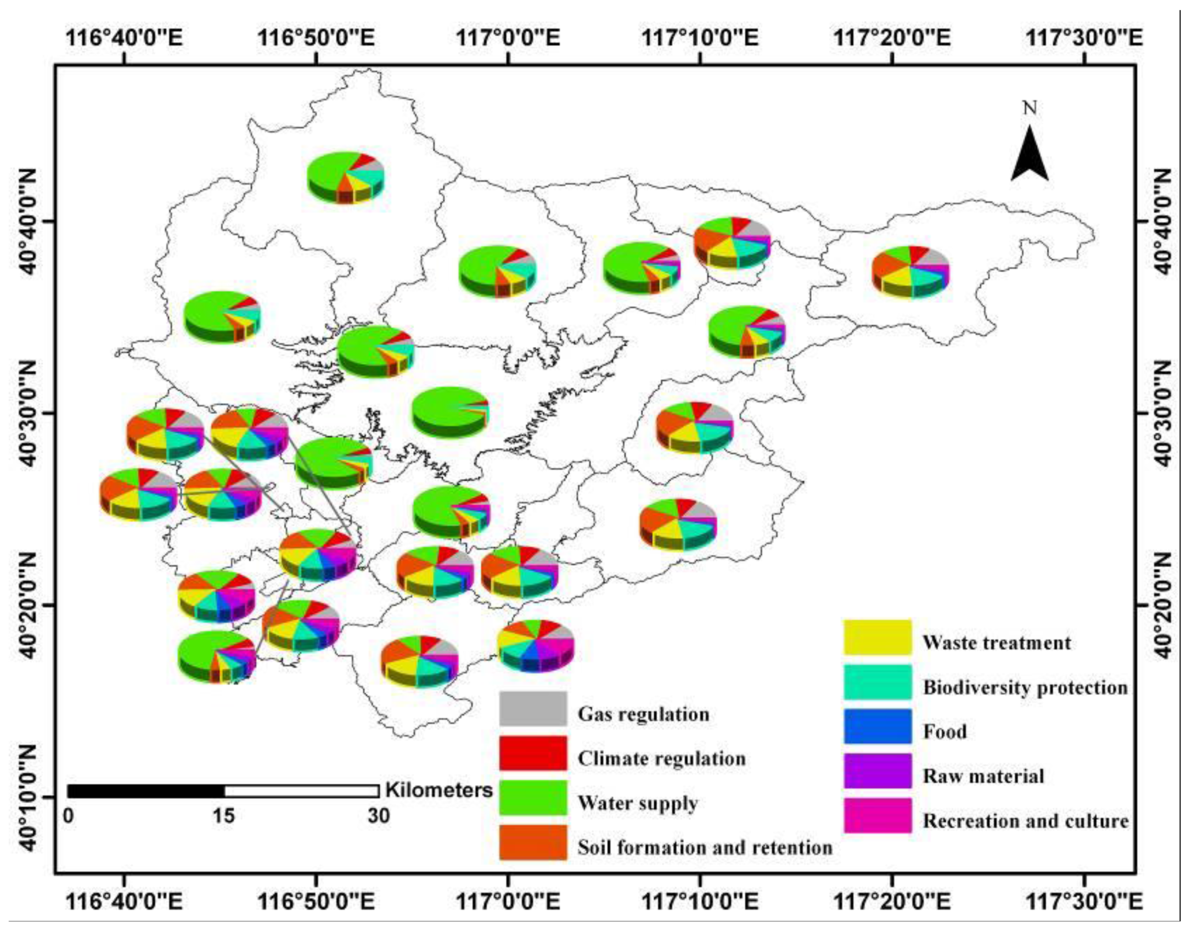 Figure 5, Figure 6, Figure 7 and Figure 8 and Table 2 show different functions of ecosystem services in Miyun County. Water supply and soil formation and retention account for 19.99% and 14.58%, respectively, indicating a high value of ecosystem services. In contrast, food and recreation and culture account for only 1.83% and 5.99%, respectively, indicating a lower value of ecosystem services. Based on their contributions, the overall rank order for each ecosystem function can be described from high to low as follows: water supply, soil formation and retention, waste treatment, biodiversity protection, gas regulation, climate regulation, raw material, recreation and culture, food.