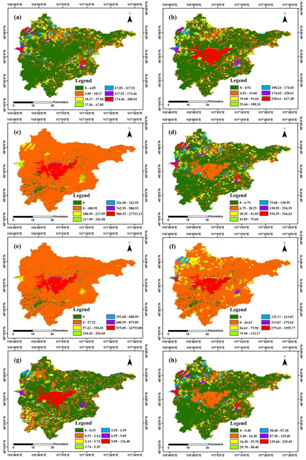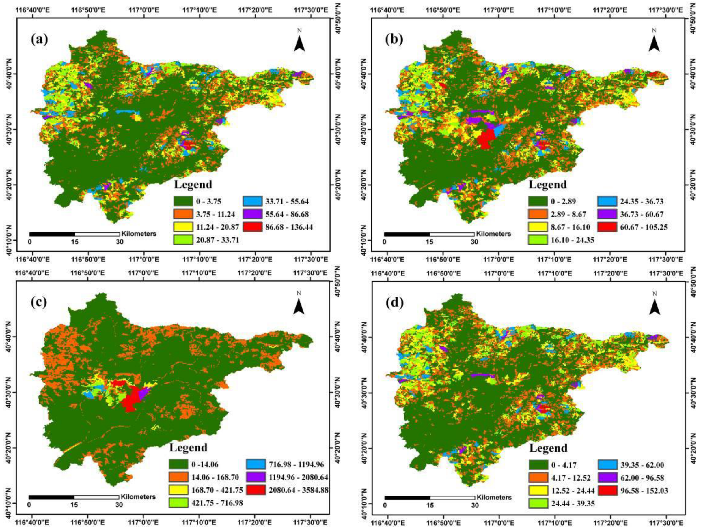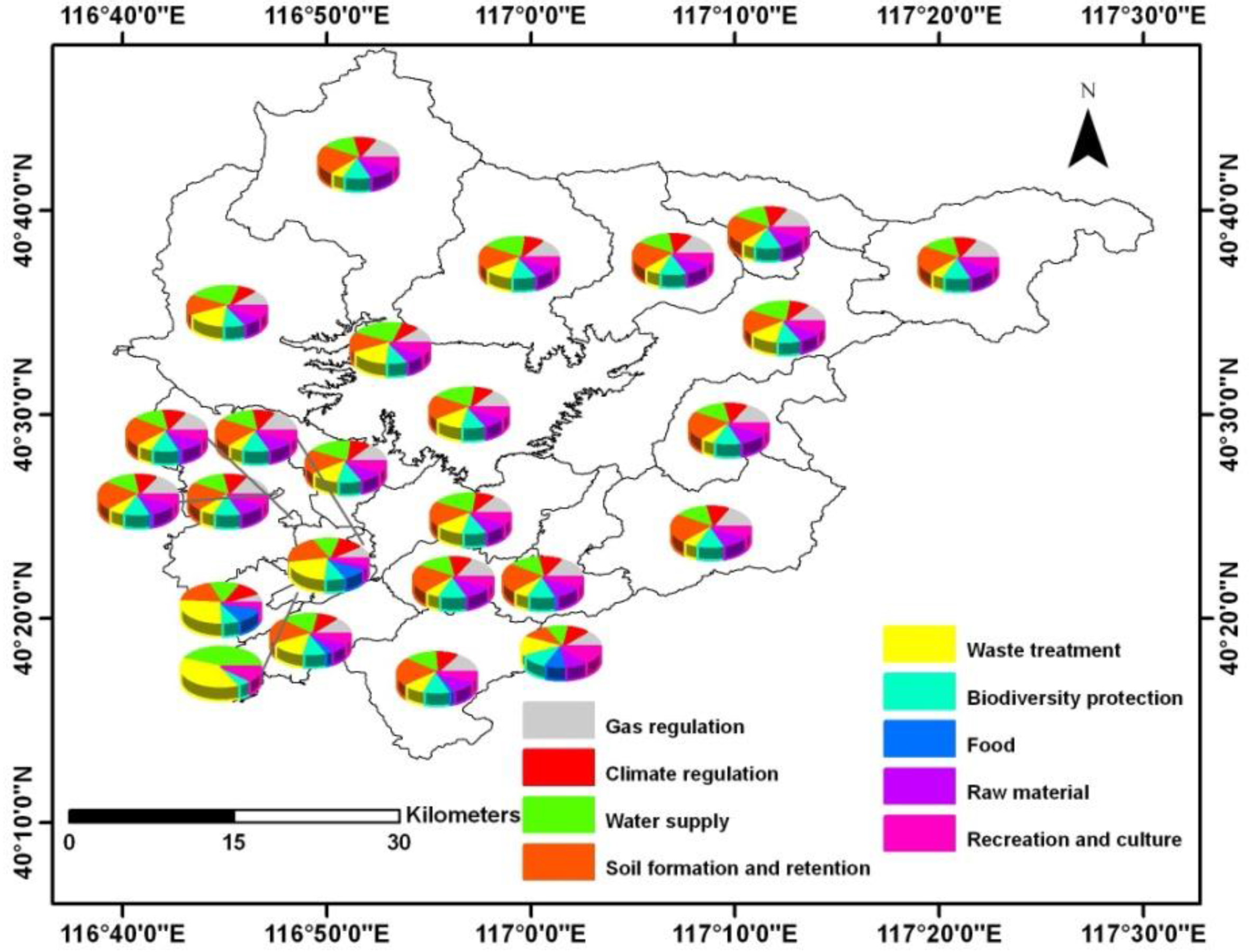 Figure 5, Figure 6, Figure 7 and Figure 8 and Table 2 show different functions of ecosystem services in Miyun County. Water supply and soil formation and retention account for 19.99% and 14.58%, respectively, indicating a high value of ecosystem services. In contrast, food and recreation and culture account for only 1.83% and 5.99%, respectively, indicating a lower value of ecosystem services. Based on their contributions, the overall rank order for each ecosystem function can be described from high to low as follows: water supply, soil formation and retention, waste treatment, biodiversity protection, gas regulation, climate regulation, raw material, recreation and culture, food.