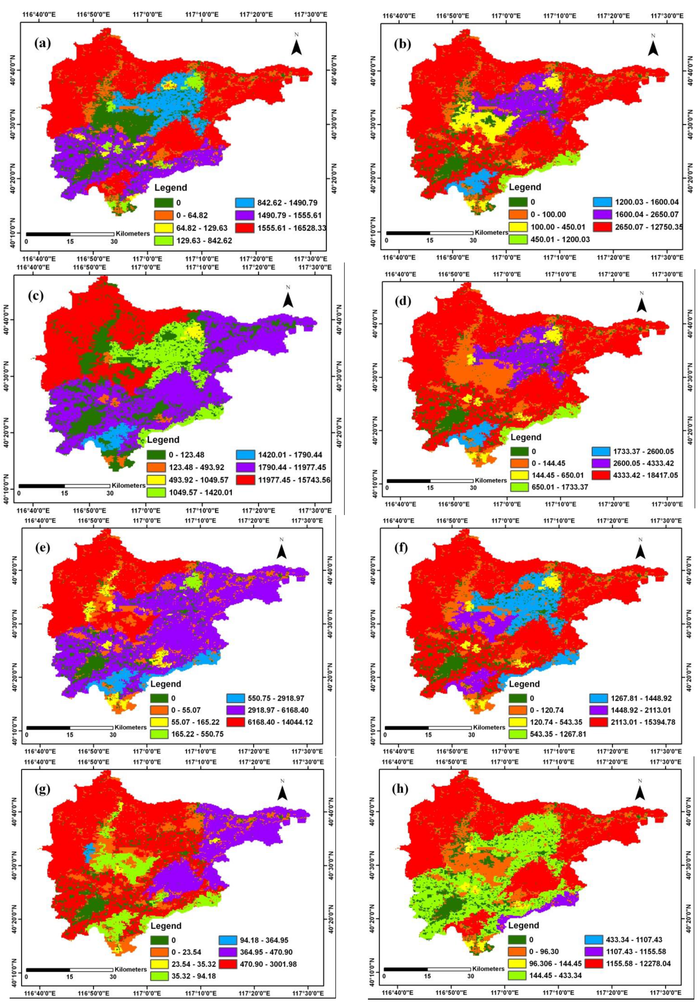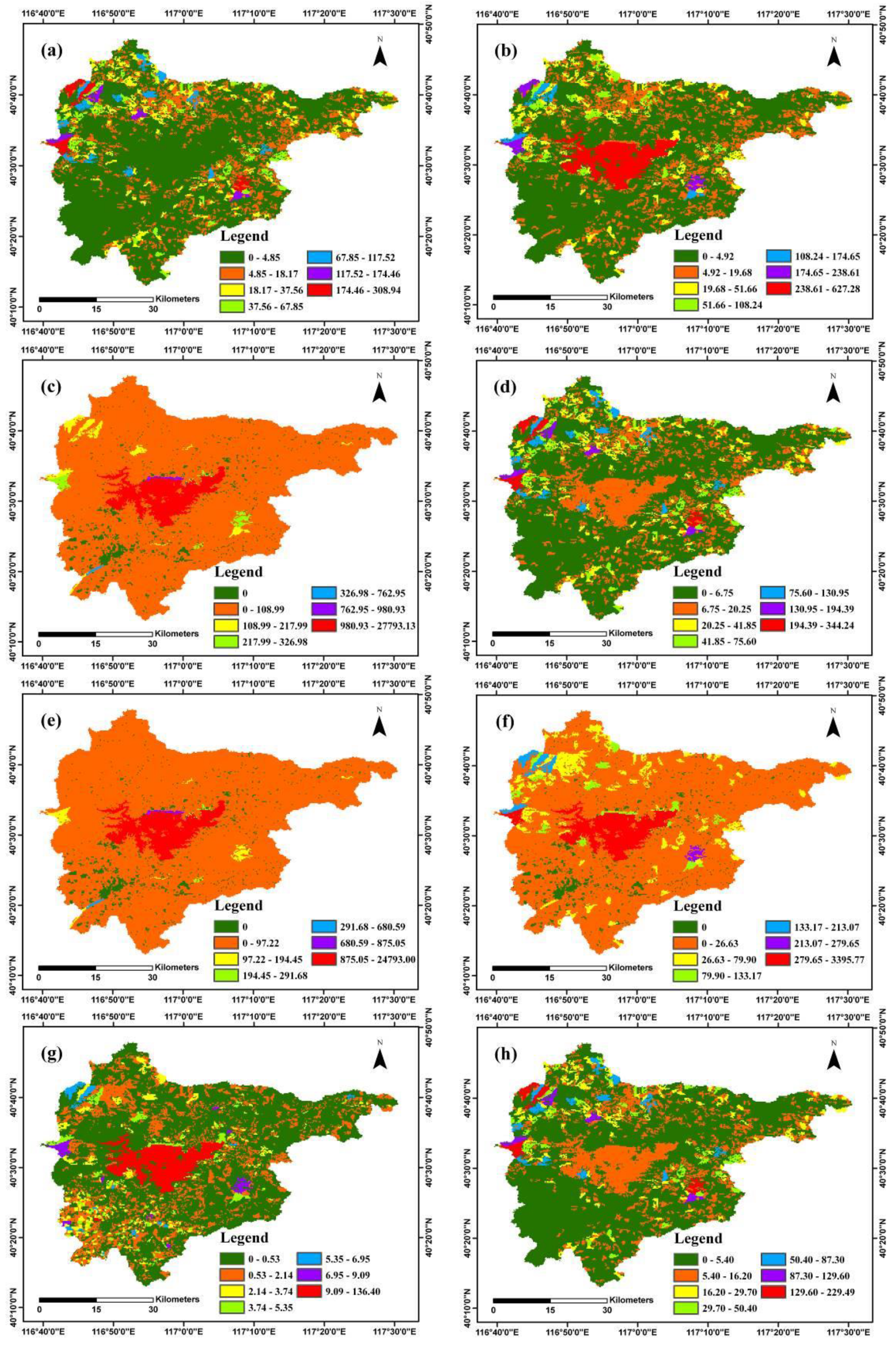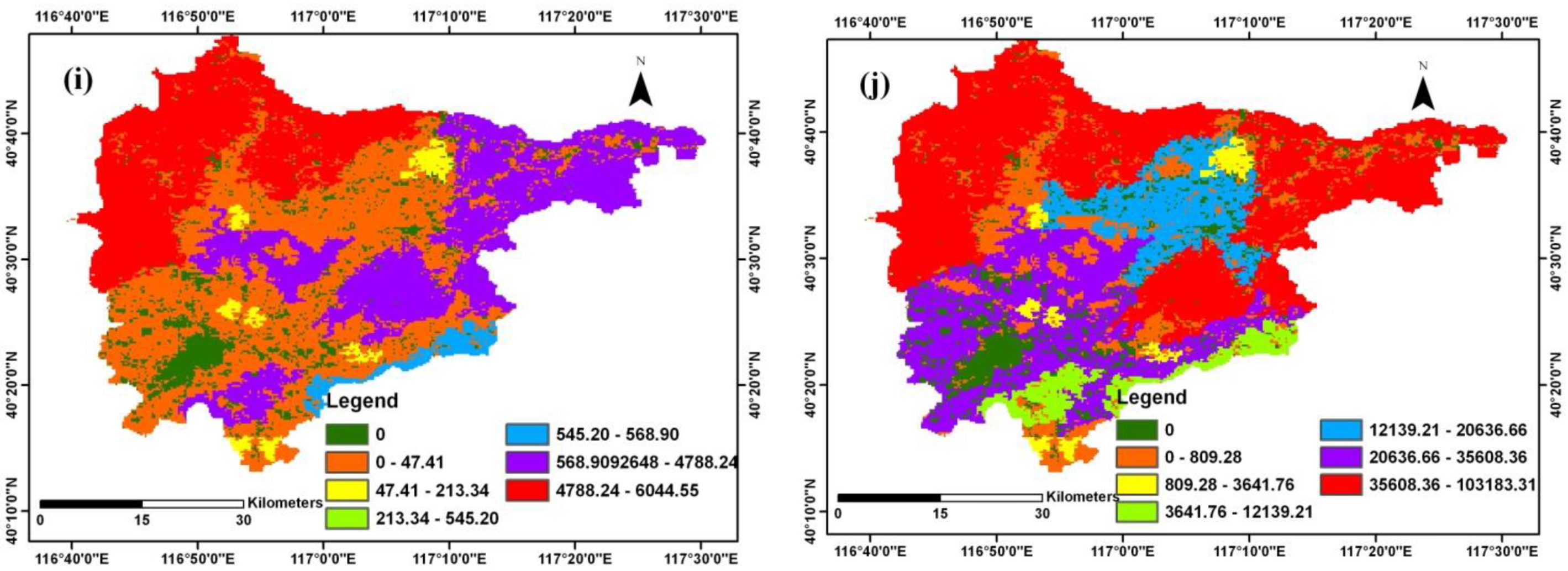 Spatial distribution of the ecosystem service value in Miyun in 2021 (104 Yuan/a). (a) Gas regulation; (b) Climate regulation; (c) Water supply; (d) Soil formation and retention; (e) Waste treatment; (f) Biodiversity protection; (g) Food; (h) Raw material; (i) Recreation and culture; (j) Total ESV.