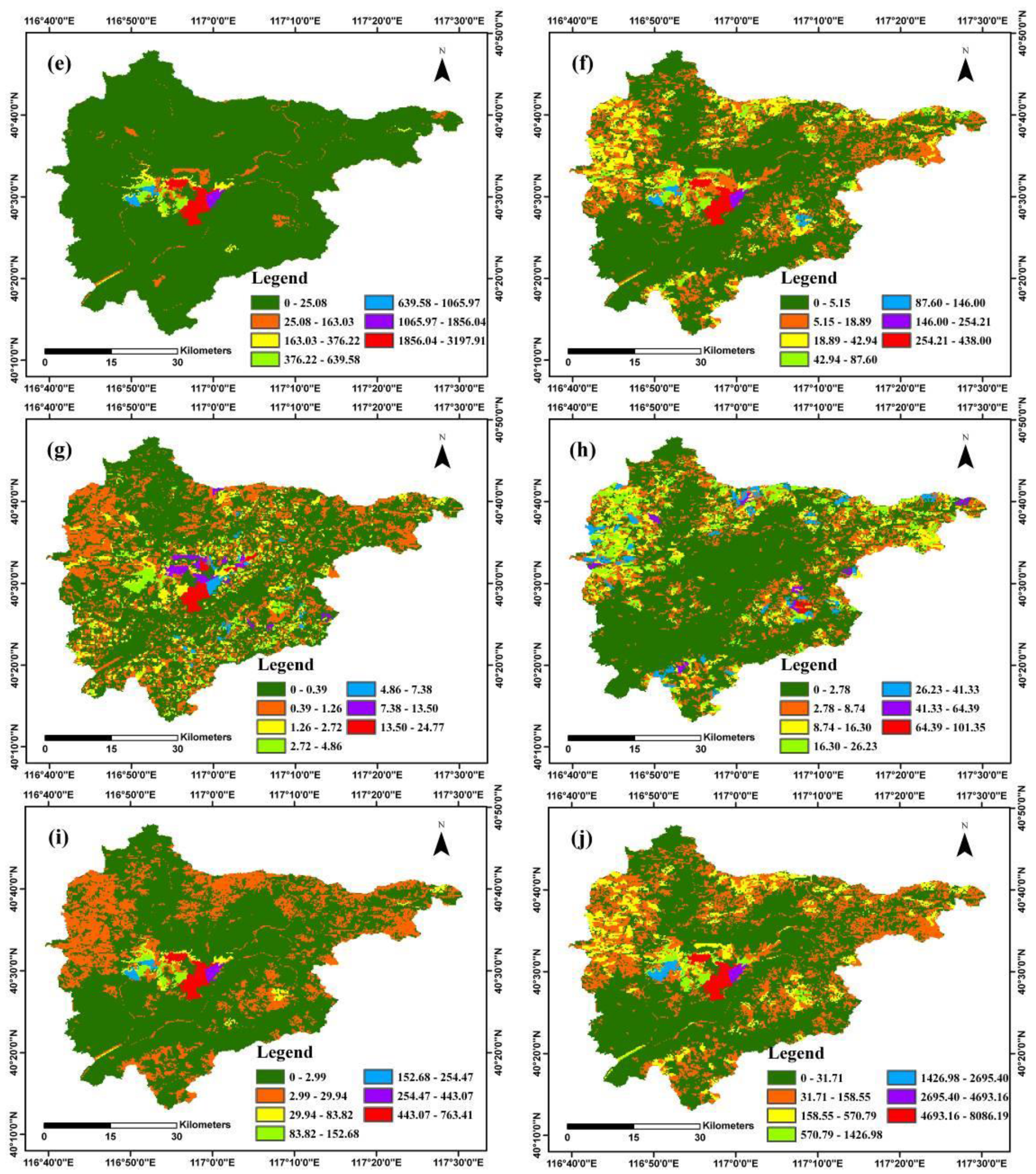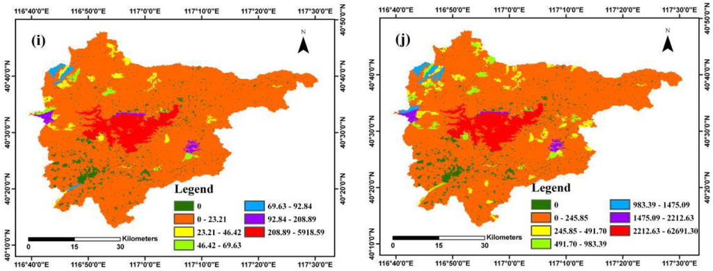 Spatial distribution of the ecosystem service value in Miyun in the improved scenario (104 Yuan/a). (a) Gas regulation; (b) Climate regulation; (c) Water supply; (d) Soil formation and retention; (e) Waste treatment; (f) Biodiversity protection; (g) Food; (h) Raw material; (i) Recreation and culture; (j) Total ESV.